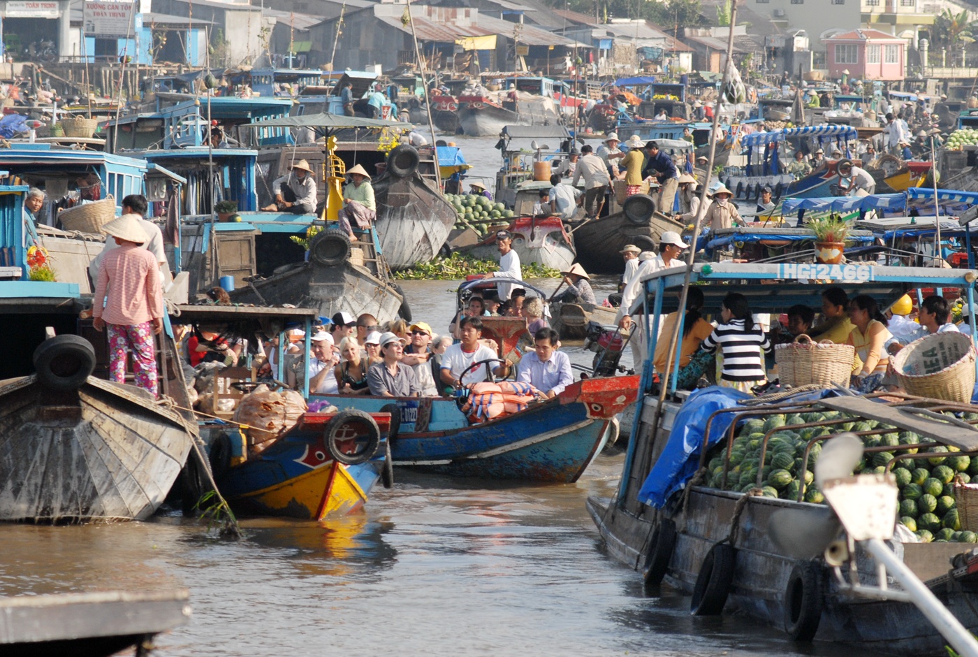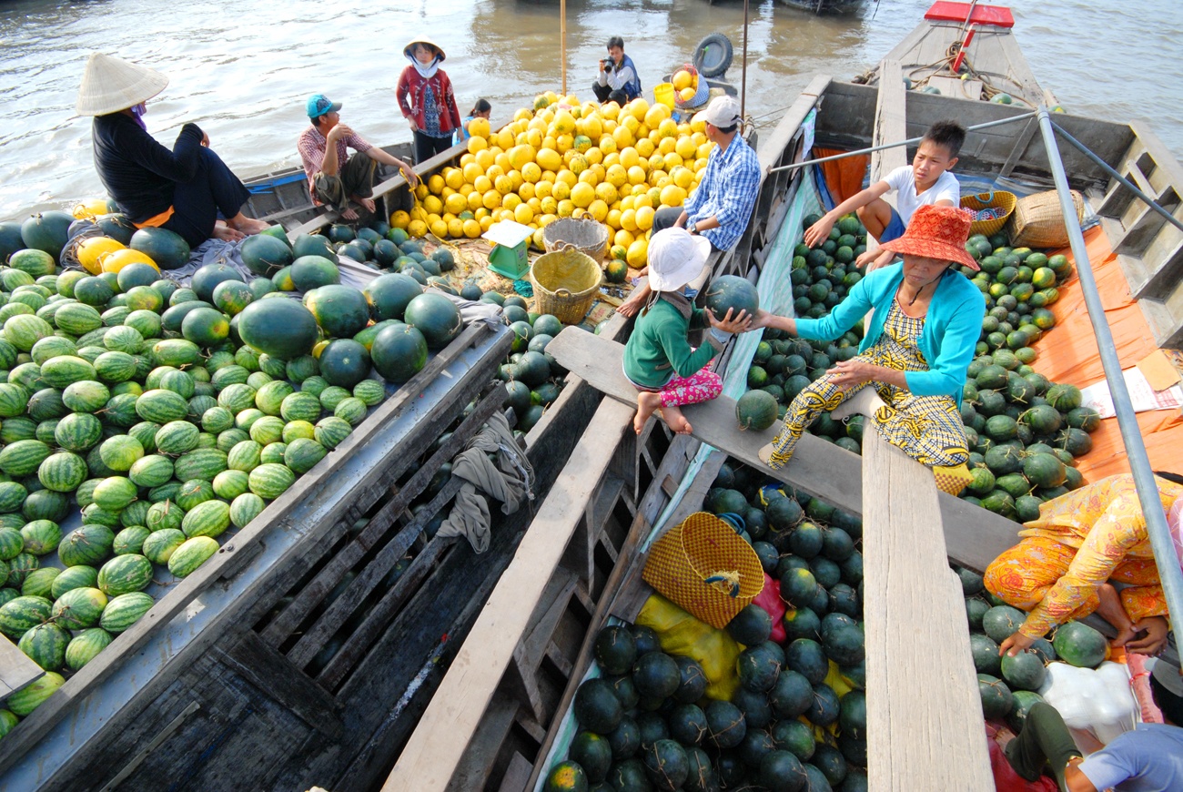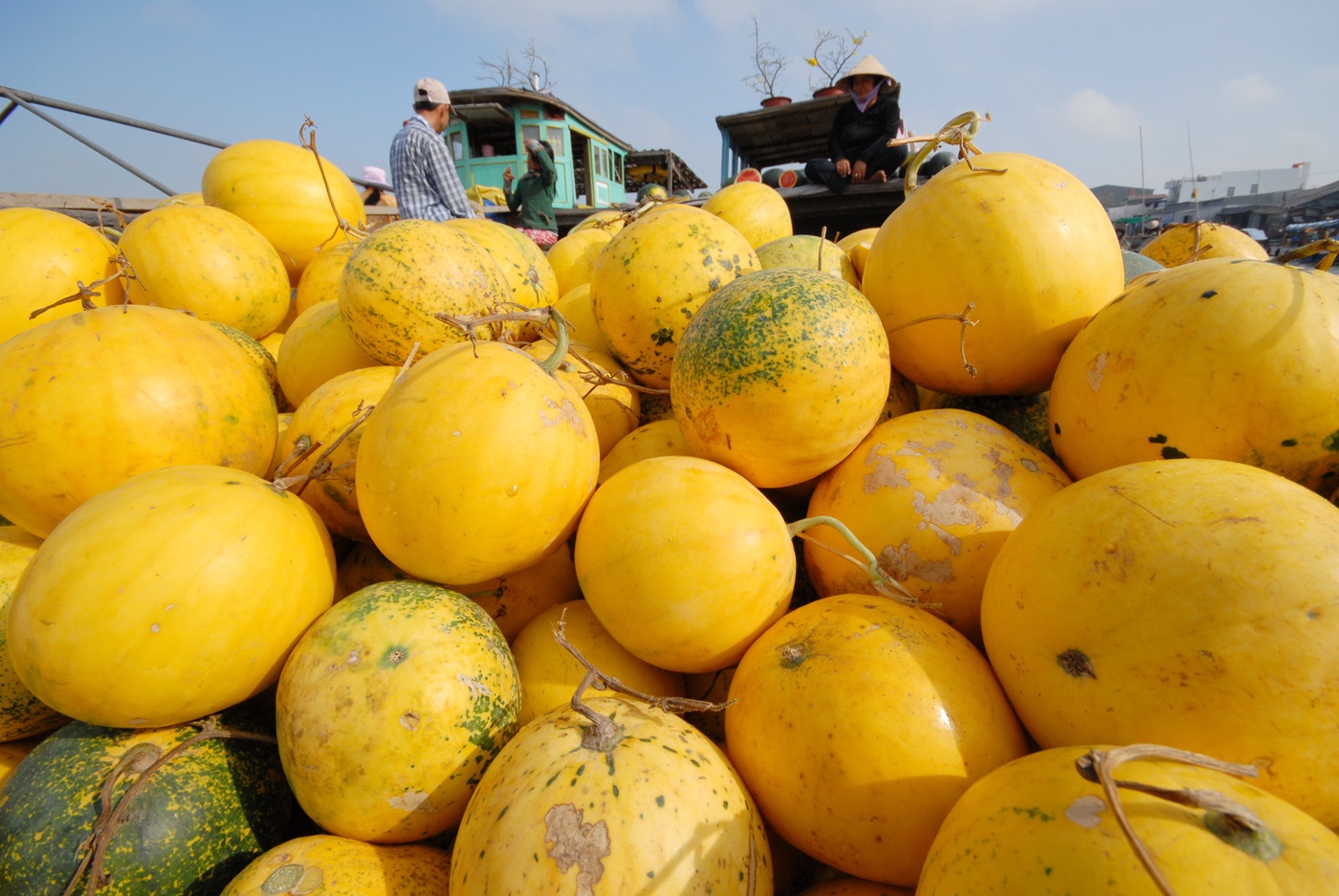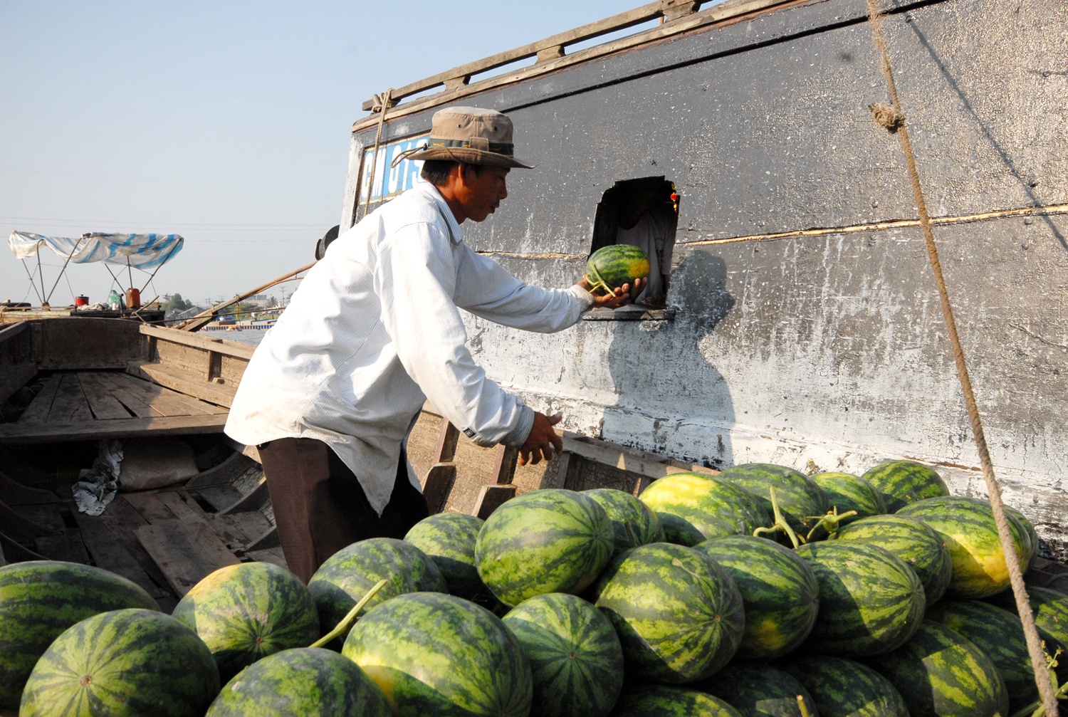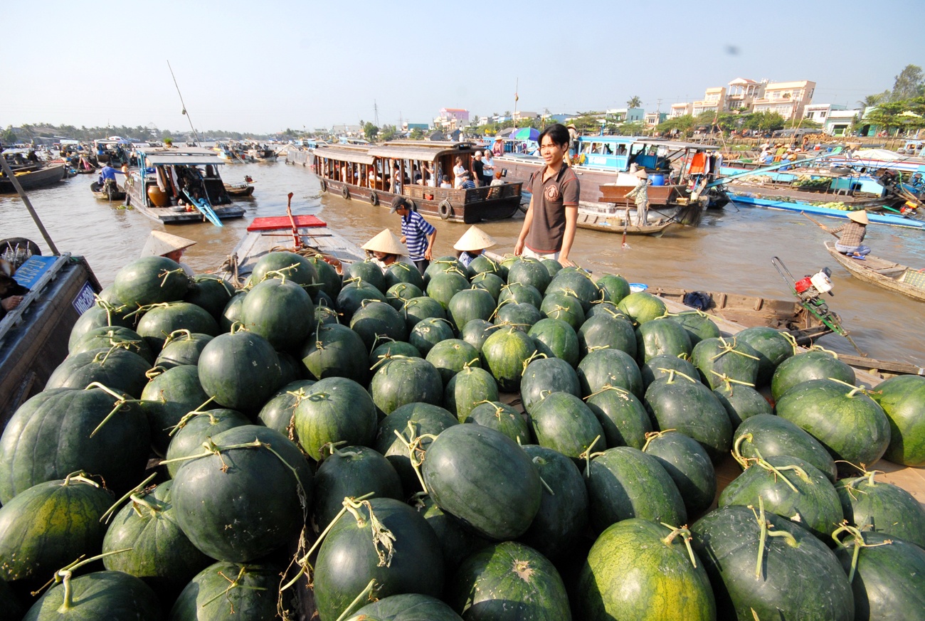 Thời tiết năm nay thuận lợi, nông dân miền Tây trúng vụ dưa hấu Tết. Ở các chợ nổi, các ghe chở dưa đậu san sát nhau. Cảnh mua bán nhộn nhịp, tấp nập diễn ra suốt cả ngày.
