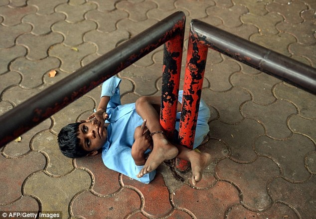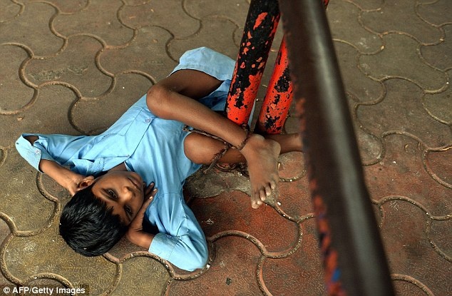 Một sợi xích buộc chân cậu bé 9 tuổi vào thanh sắt của trạm xe buýt tại thành phố Mumbai, Ấn Độ trong buổi chiều hè nắng nóng.