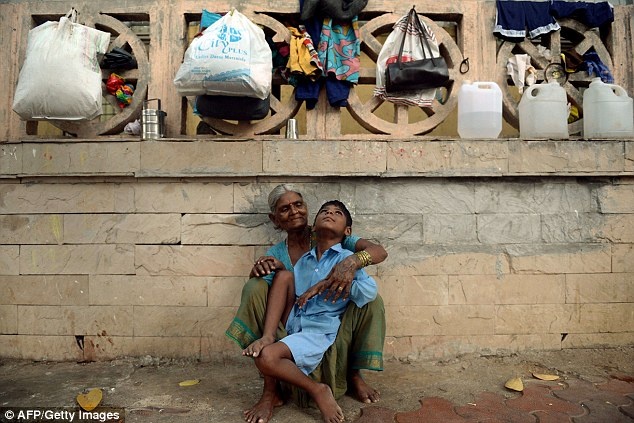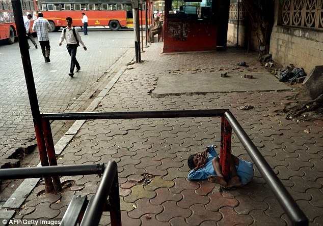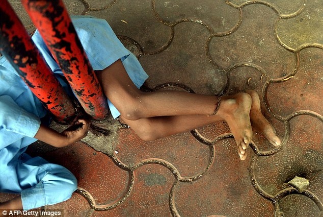 Những người đi đường dường như đều không chú ý đến cậu bé mặc áo xanh nằm trên vỉa hè với sợi xích ở chân ở thành phố Mumbai.