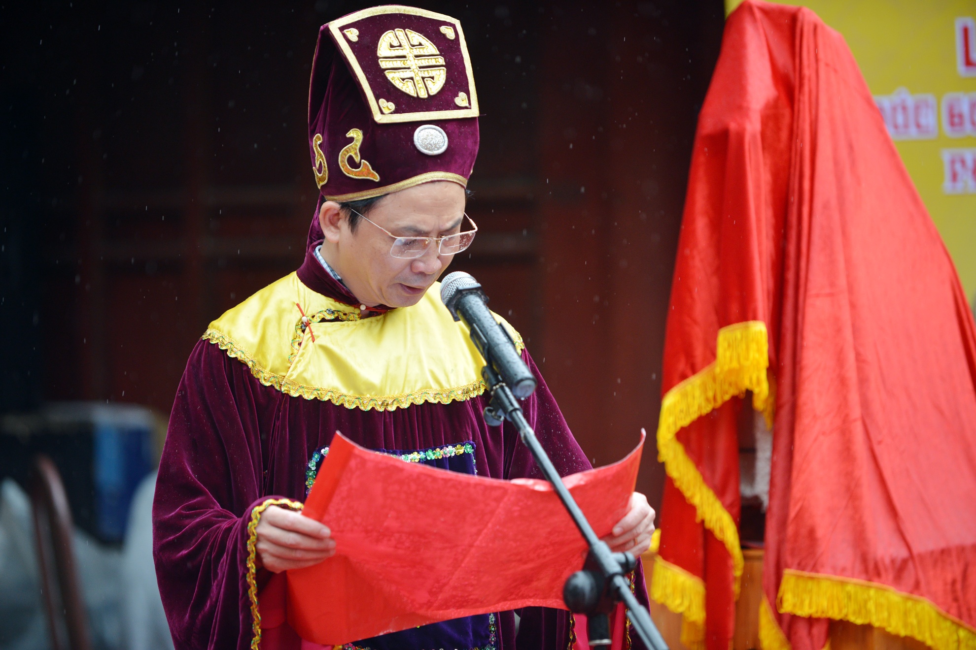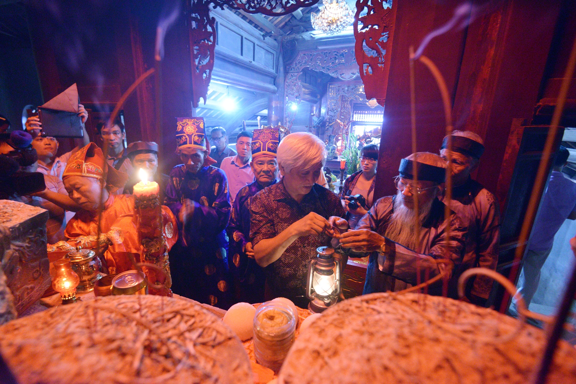 | Sau khi thực hiện lễ cầu an, cầu phúc, cầu hòa bình, thịnh vượng, các đại biểu đã thực hiện nghi lễ xin lửa đúc tượng vàng Thánh Gióng. |