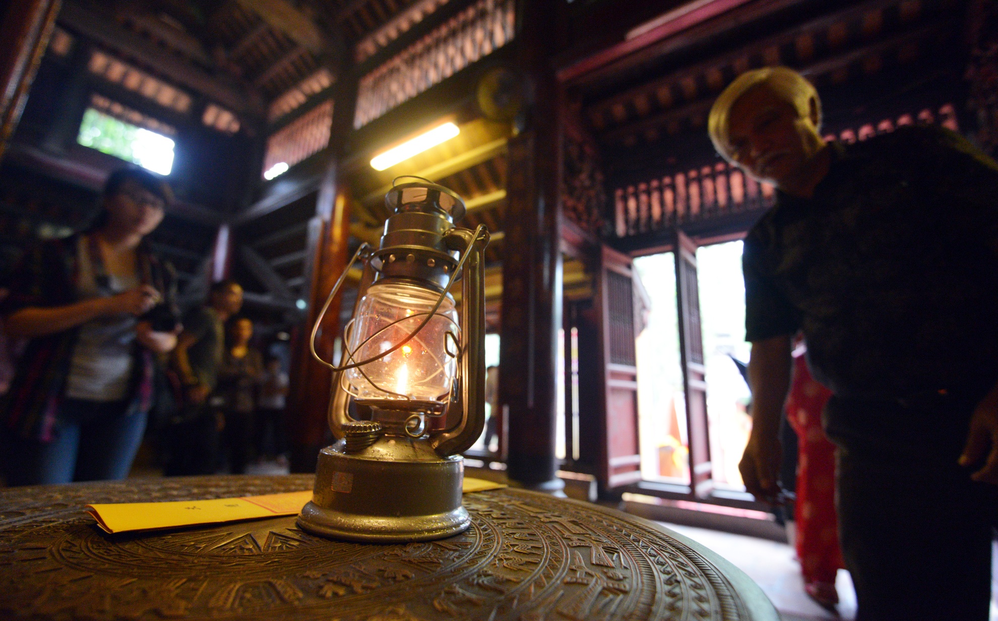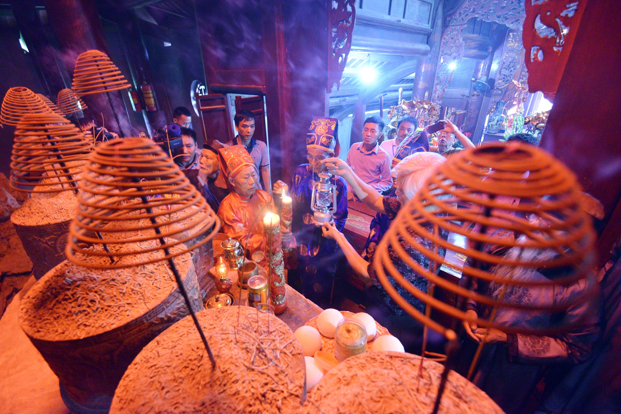 Lửa thiêng được truyền tay nhau và cuối cùng đưa cho các vị bô lão di chuyển ra phía ngoài điện chính đền Sóc.