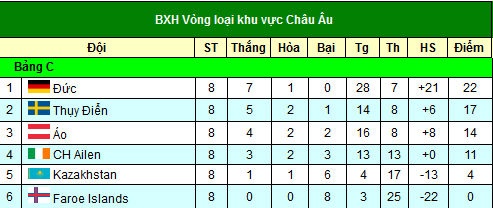 | ĐT Đức dẫn đầu bảng C và có cơ hội rất lớn để giành vé trực tiếp dự VCK World Cup 2014. |