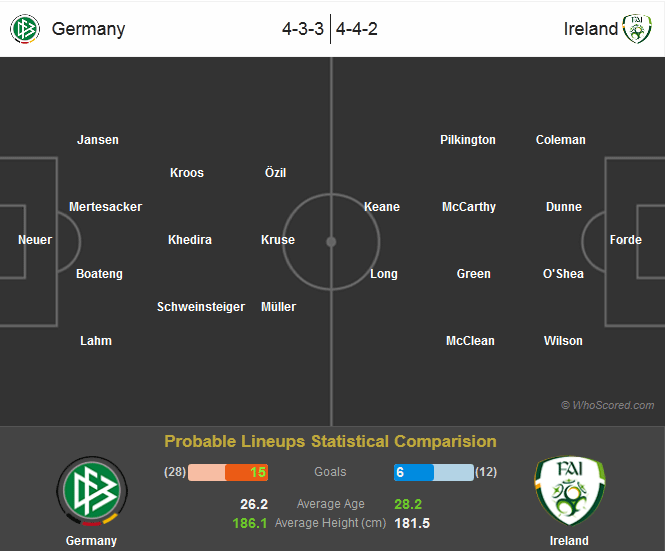 | Đội hình dự kiến ra sân của ĐT Đức và CH Ireland. |
