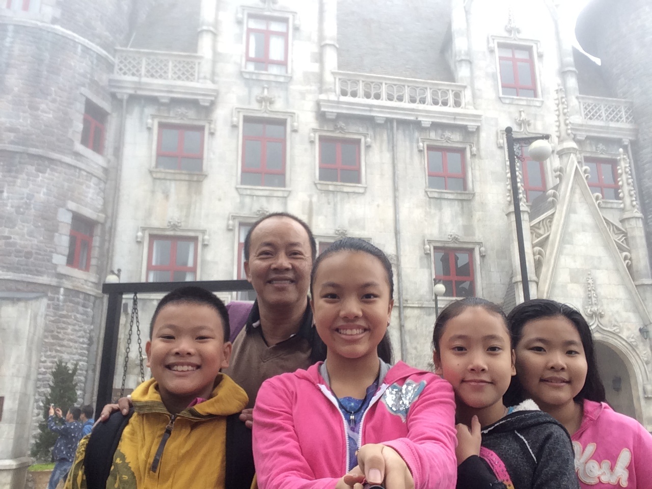 | Đức Hải và bốn con trong một kỳ nghỉ của cả gia đình gần đây. |