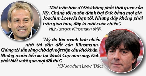 Với Klinsmann và Vogts, hai người từng dẫn dắt ĐT Đức trong quá khứ, Mỹ hiểu quá rõ những điểm mạnh yếu của đối thủ. Thế nên, có thể khẳng định cuộc chiến đêm nay giữa Đức và Mỹ không chỉ là màn tỷ thí trên sân cỏ giữa cầu thủ hai đội mà còn là một cuộc đấu trí căng thẳng trên băng ghế huấn luyện. Bởi vậy, không chỉ riêng Mỹ mà trận cầu đêm nay cũng sẽ là thử thách khó khăn cho Loew và các cầu thủ Đức.