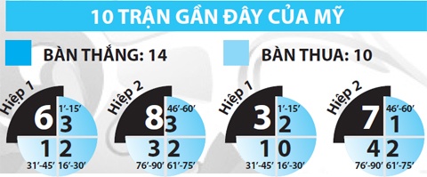 Mỹ đã ghi bàn trong 8 trận gần nhất tại World Cup. Đáng chú ý, 7/8 bàn thắng gần nhất mà Mỹ ghi được đến trong hiệp 2.
