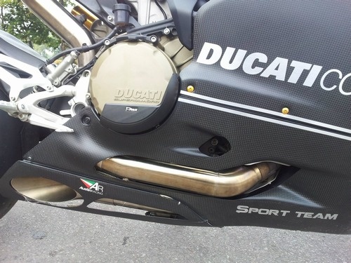 Tuy nhiên, đó chưa phải là điểm nổi bật nhất trên chiếc Ducati 1199 Panigale S độ Full Carbon này. Điểm gây chú ý nhất chính là bộ ống xả Austin Racing Full System AR22 được làm bằng chất liệu Inconel và có trọng lượng chỉ 2.6kg giúp xe giảm trọng lượng đáng kể, nếu tính luôn cả dàn áo full carbon thì xe giảm trọng lượng khoảng 10kg. Với bộ ống xả trị giá lên đến 4.000 USD này, sức mạnh của xe được tăng lên hơn 10 mã lực.