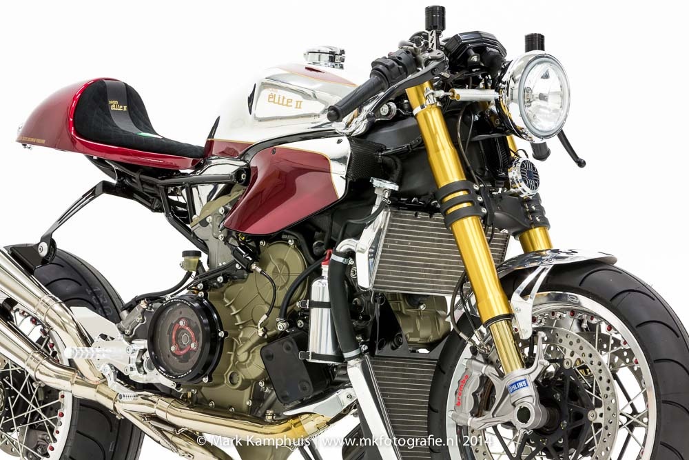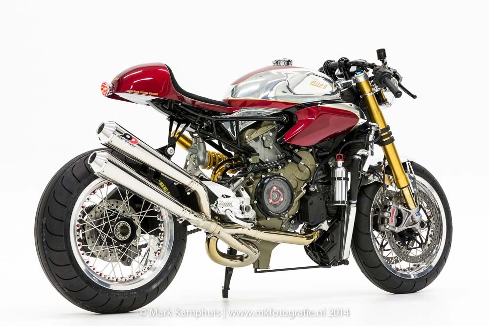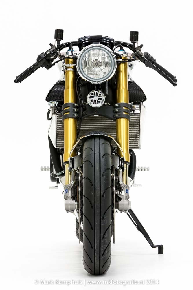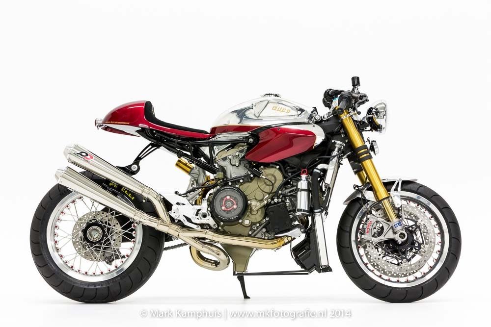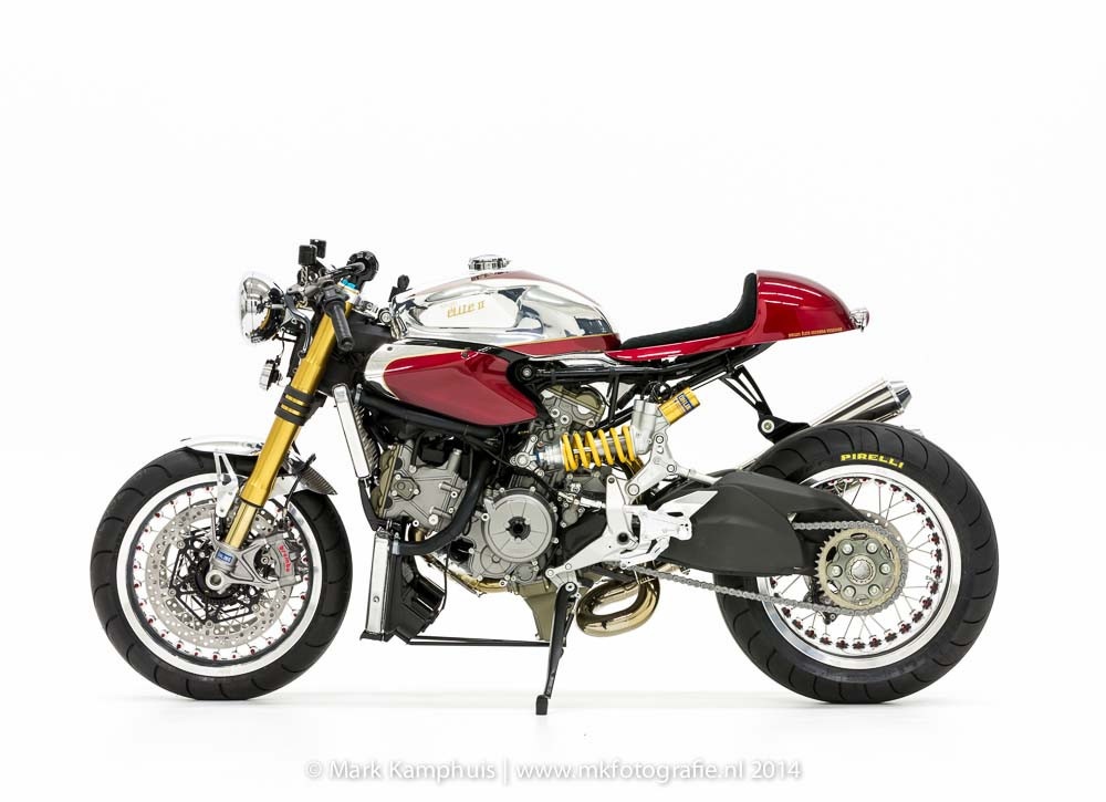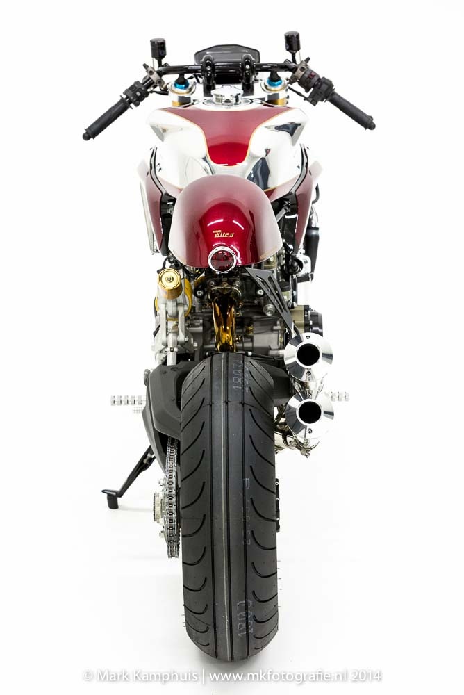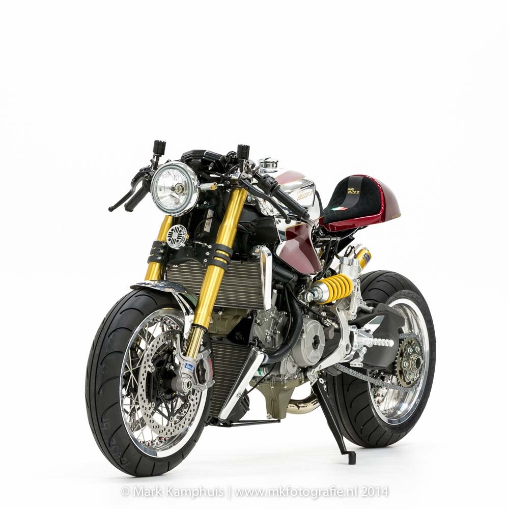 | Những người thợ độ của Hà Lan đã mổ xẻ siêu mô tô của Ý ra và thay đổi cho nó bằng ngoại hình của một mẫu xe phong cách cafe racer điển hình. Xe sử dụng lốp không xăm kích thước lớn, bánh sau ngự trên gắp đơn. |