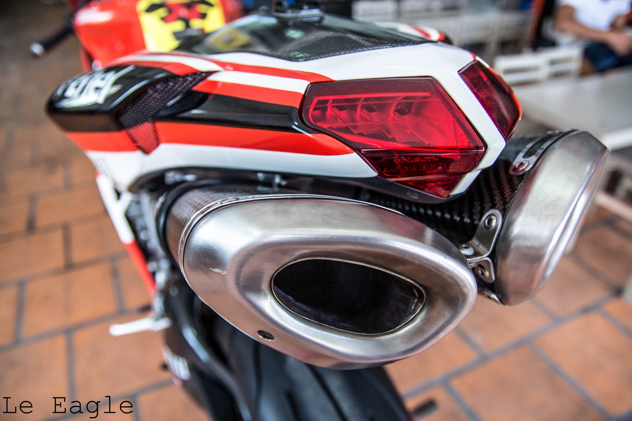 | Tâm điểm trên bản độ này là hệ thống ống xả Termignoni Full System cùng cổ pô titan. Ưu điểm mà cổ pô titan mang lại là trọng lượng cực nhẹ và âm thanh sẽ thay đổi khi nhiệt độ tăng. |