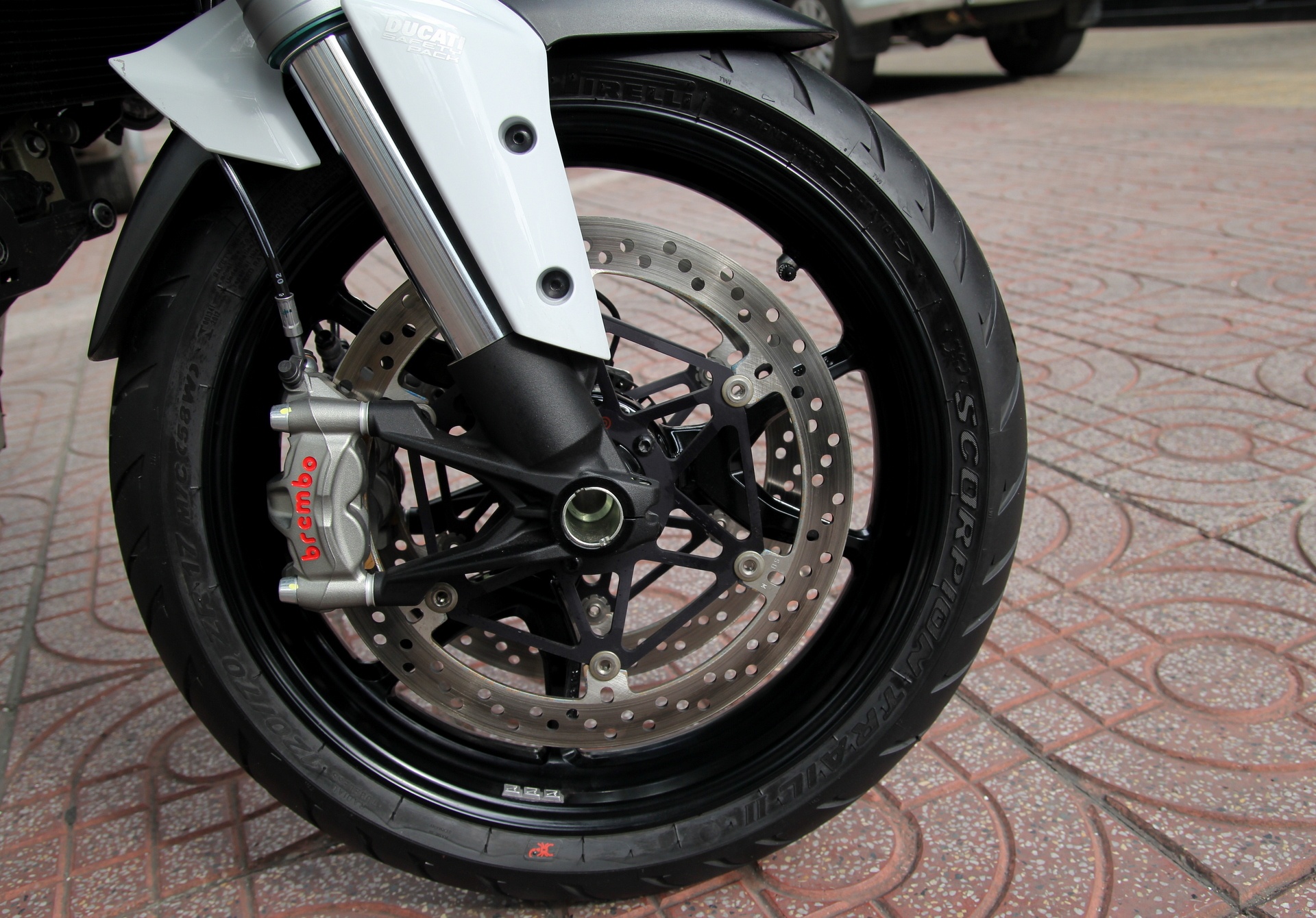 Hệ thống an toàn phía trước bao gồm đĩa phanh kép đường kính 330 mm, kết hợp với kẹp phanh Brembo 4 piston, ABS tiêu chuẩn. Hệ thống treo trước gồm cặp phuộc ngược đường kính 48 mm, điều chỉnh lực nén điện tử thông qua hệ thống Ducati Skyhook Suspension (DSS).