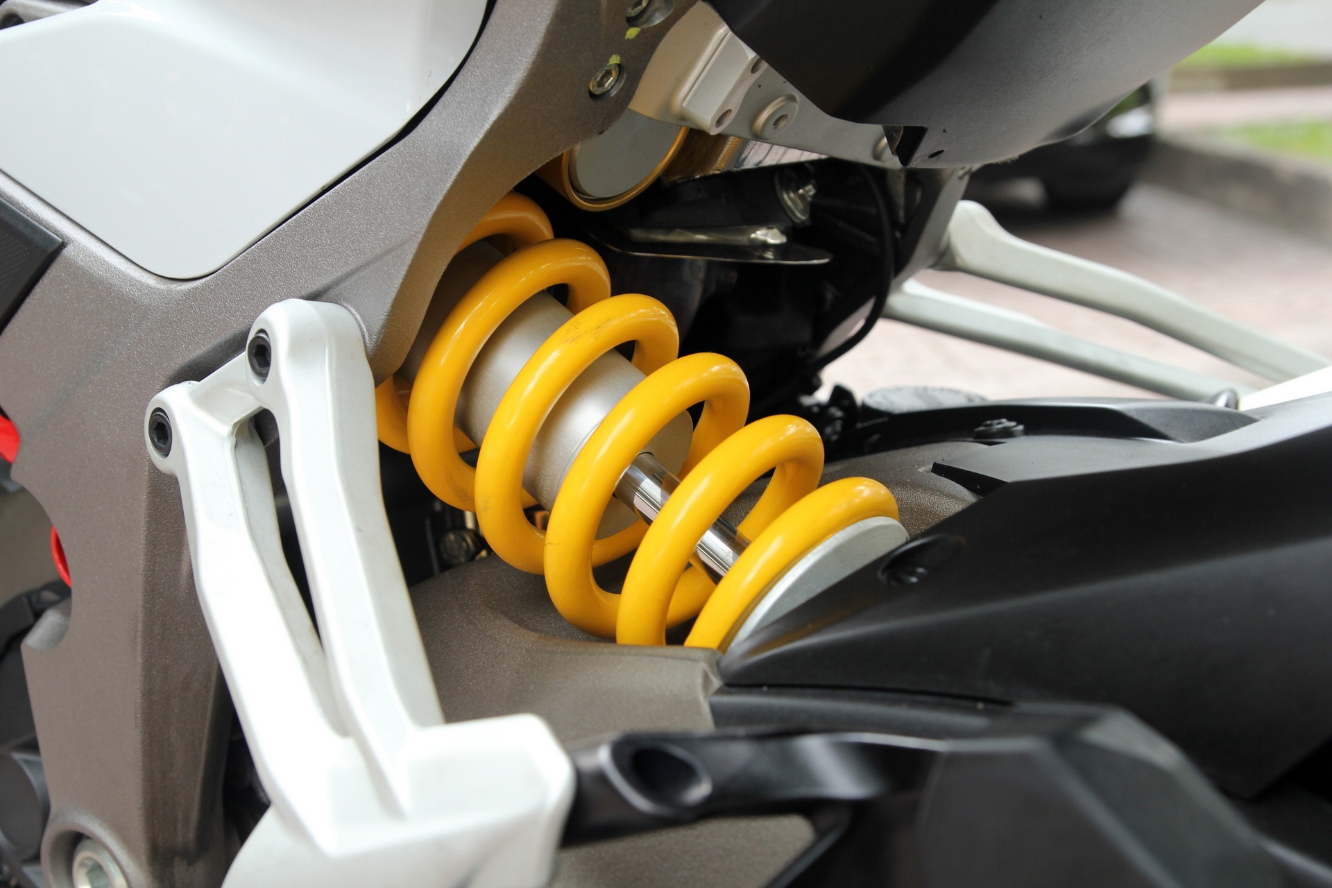 Hệ thống treo sau monoshock có thể điều chỉnh lực nén điện tử, phù hợp với từng chế độ chạy một người hoặc hai người.