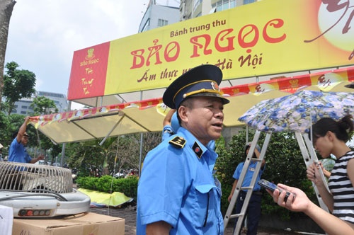 | Lực lượng thanh tra giao thông tháo gỡ điểm bán bánh trung thu Bảo Ngọc tại đường Duy Tân (Cầu Giấy, Hà Nội). |
