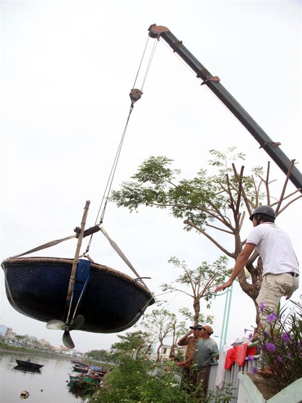 Trước tình thế này, hàng chục ngư dân phải nhanh chóng đi thuê xe cầu để cẩu thuyền lên bờ tránh bão. Theo những ngư dân ở đây, mỗi chuyến cẩu như vậy, tài xế có khi lấy dăm chục ngàn tiền công nhưng có người hoàn cảnh quá khó khăn thì cẩu miễn phí. Đến lúc 15h chiều cùng ngày, gần 50 thuyền các loại được cẩu đưa lên bờ an toàn.
