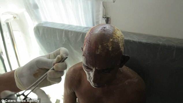Một người đàn ông phải băng bó đầu bởi các vết thương sau khi tham gia lễ hội. |
