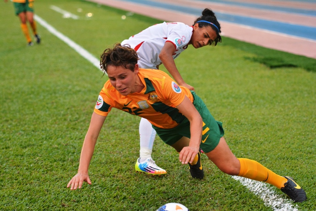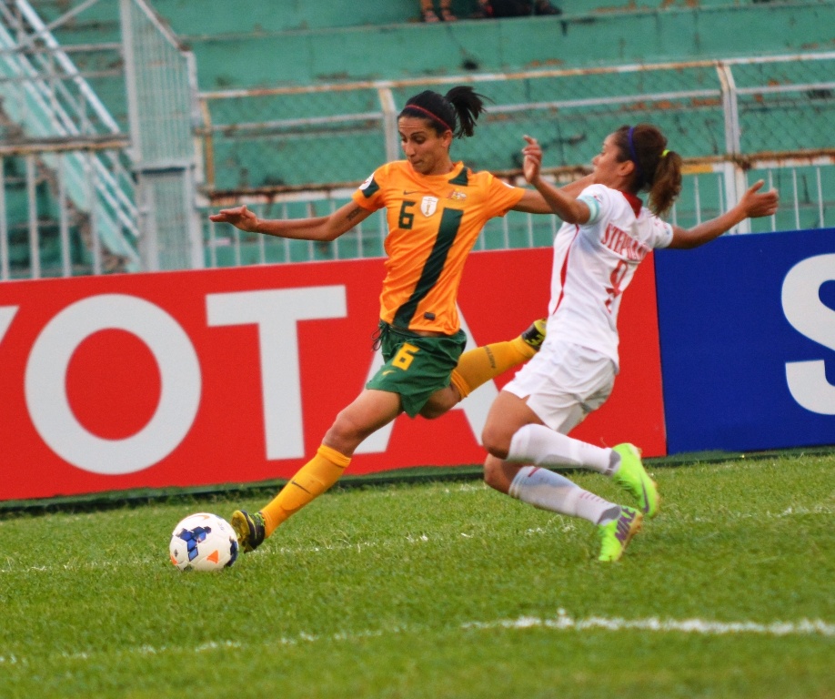 Lối chơi được Australia sử dụng trong hiệp 1 là tạt bóng đánh đầu, nhằm tận dụng thể hình tốt của tiền đạo đội trưởng Kathryl Gill. Tuy nhiên, trong hơn 30 phút đầu tiên, miếng đánh này không hiệu quả.