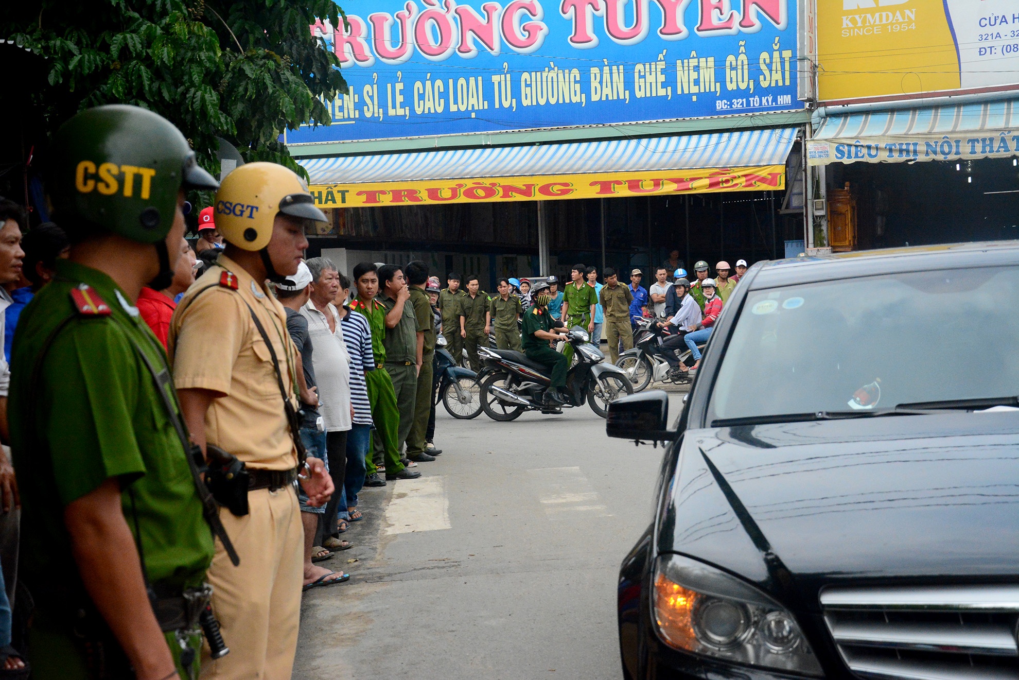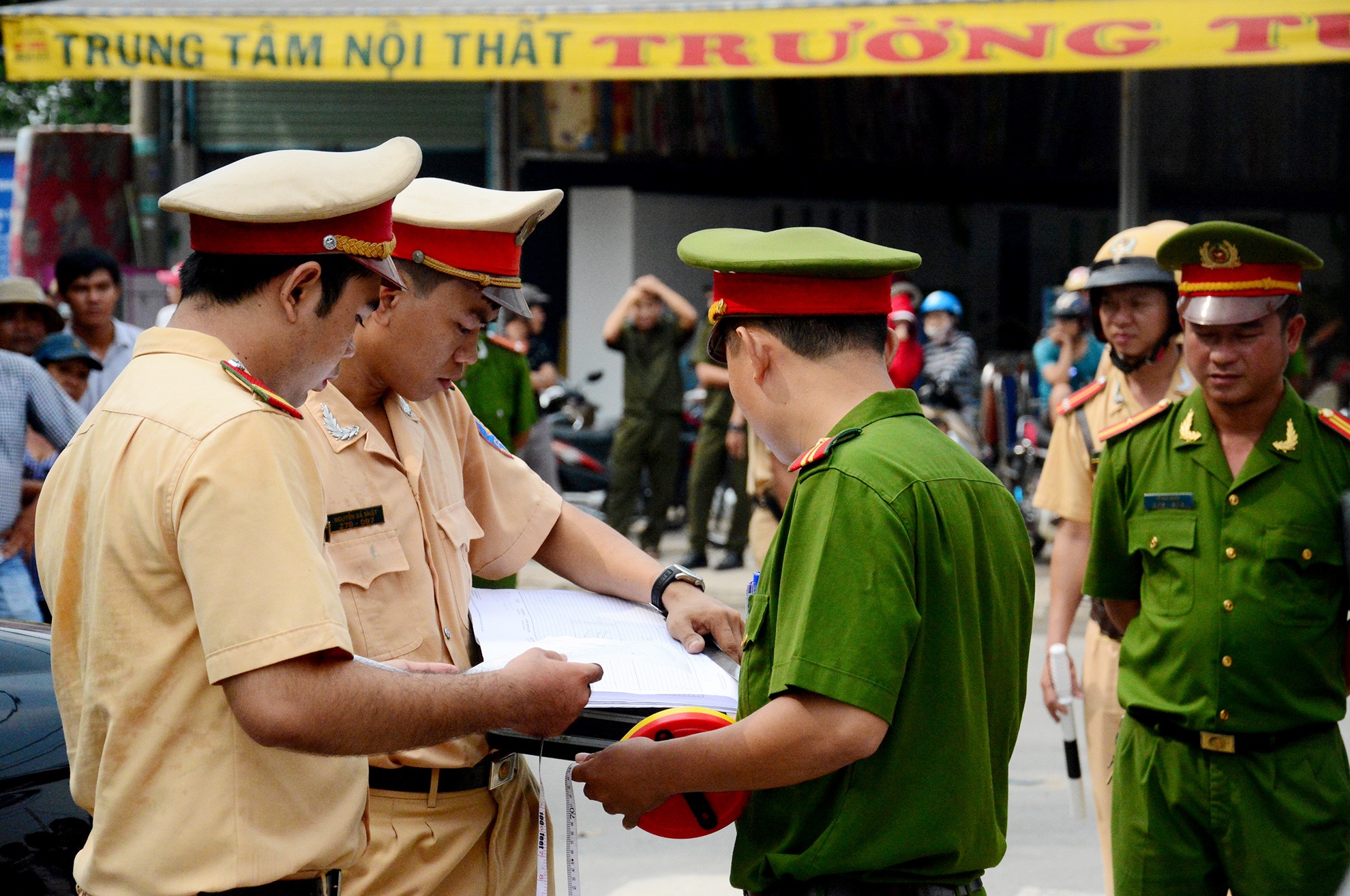 Suốt buổi dựng hiện trường, lực lượng chức năng ứng trực phân luồng giao thông từ xa, tránh ùn tắc. Khá đông người dân đứng 2 bên đường theo dõi nhà chức trách làm nhiệm vụ.