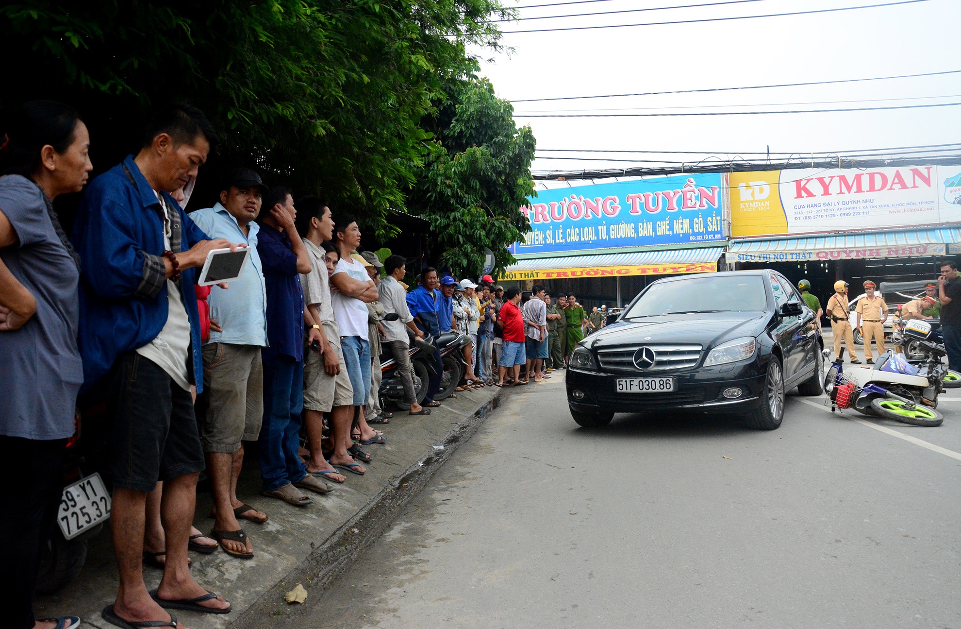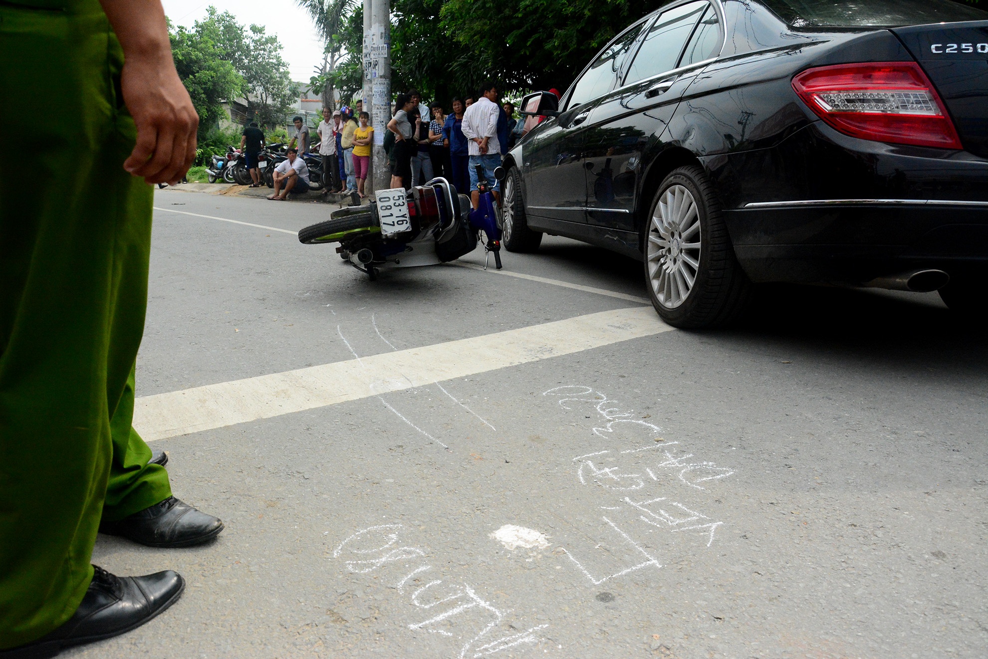9h ngày 23/10, cảnh sát đã dựng lại hiện trường vụ va chạm giao thông xảy ra tại ngã ba Cống Đôi (huyện Hóc Môn, TP HCM). Theo diễn biến vụ việc, chiều 6/10, anh Thanh (38 tuổi) lái chiếc Mercedes đến địa điểm trên thì va chạm với xe máy do vợ tên Giang (41 tuổi) điều khiển.