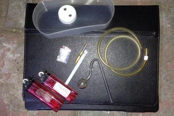 Bên trong túi nylon của khách mang theo, lực lượng chức năng tìm thấy bộ cóng thủy tinh dùng để “đập đá”.