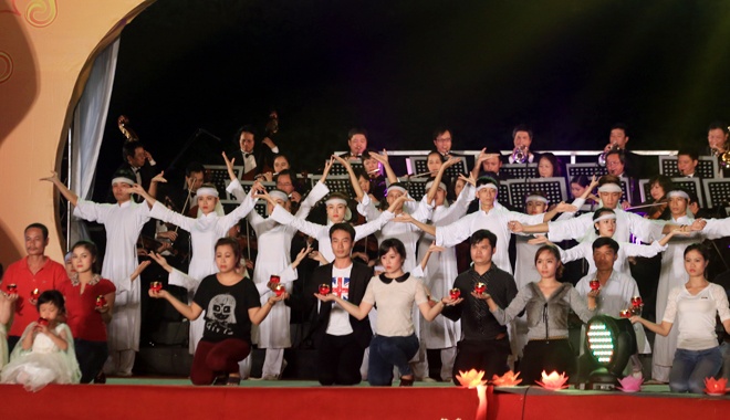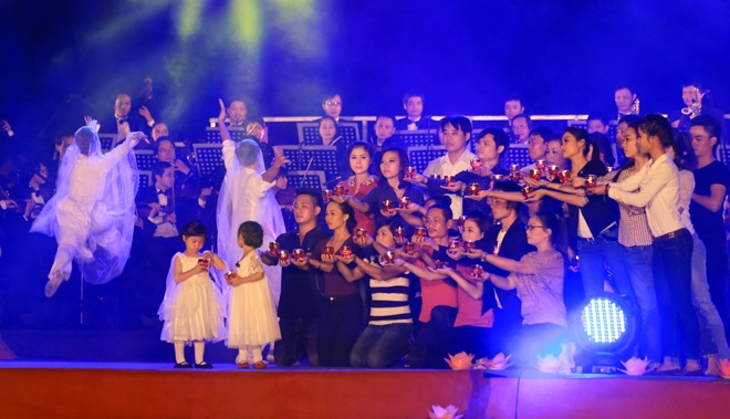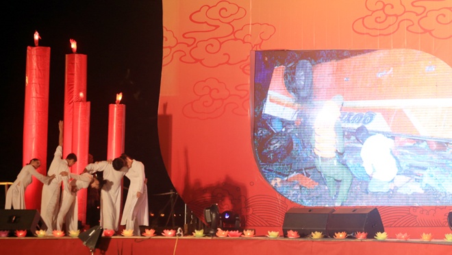 | Phó Thủ tướng Nguyễn Xuân Phúc và Bộ trưởng Bộ GTVT Đinh La Thăng thả hoa đăng cầu nguyện cho các nạn nhân tại hồ phóng sinh chùa Bái Đính, Ninh Binh tối 16/11. |