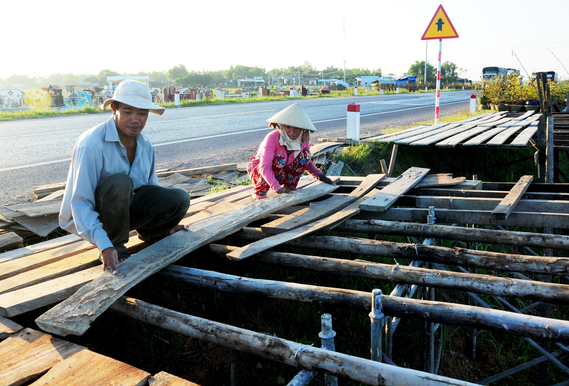 Còn hai tuần nữa đến tết Nguyên đán Bính Thân 2016, hàng trăm người dân Bình Định tất bật tận dụng bộ khung giàn giáo (vốn dùng trong xây dựng) dựng lều ven quốc lộ 1 để bán mai tết cho khách đi lại trên hành trình Bắc- Nam.