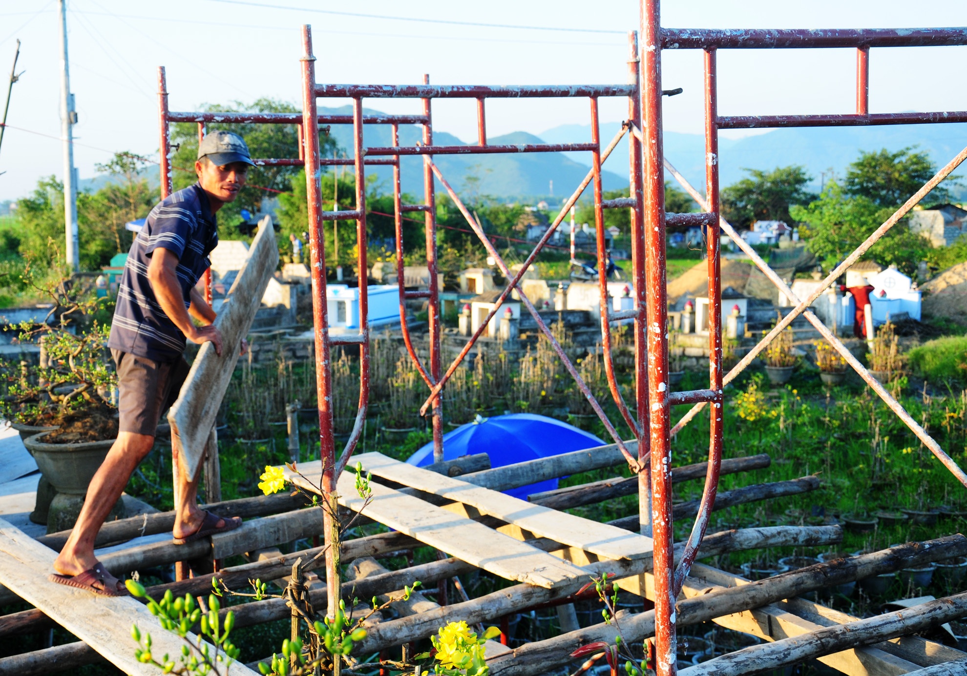 Vợ chồng anh Trần Ba và Nguyễn Thị Hồng Nga (ngụ xã Nhơn An, thị xã An Nhơn) dùng bộ khung sắt giàn giáo, ván gỗ cốt pha tạo mặt bằng vừa dựng lều vừa bày bán chậu mai. Hai anh chị hy vọng, với sàn gỗ rộng bày hoa, giá sẽ cao hơn so với bán cho thương lái tại vườn. "Vườn mai của tôi hiện còn 100 chậu (5 đến 20 tuổi) mong bán được giá để đón Tết đầm ấm", anh Ba chia sẻ.