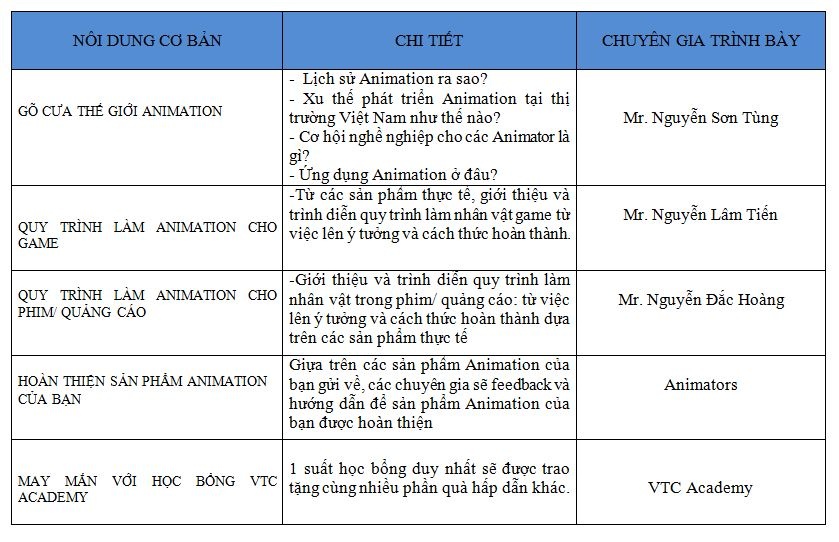 Chương trình chuyên ngành animation (hoạt hình) đầu tiên năm 2014 tổ chức tại trung tâm công nghệ và nội dung số VTC, nơi quy tụ các chuyên gia về animation, nơi chia sẻ kỹ năng và truyền cảm hứng về animation đến các bạn trẻ Việt Nam.