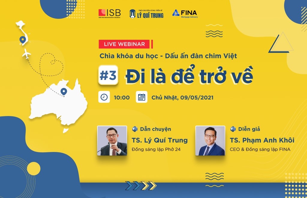 Số thứ 3 của chuỗi talkshow "Chìa khóa du học - Dấu ấn đàn chim Việt" sẽ diễn ra vào 10h ngày 9/5. Tiến sĩ Lý Quí Trung sẽ trò chuyện cùng tiến sĩ Phạm Anh Khôi - CEO và Đồng sáng lập FINA - về chủ đề “Đi là để trở về”. Buổi trò chuyện sẽ giúp các bạn trẻ, đặc biệt là du học sinh còn đang phân vân trước lựa chọn nên ở lại hay quay về nước lập nghiệp, đưa ra quyết định đúng đắn. Các bạn trẻ có thể đăng ký tham gia thảo luận, hỏi đáp trực tiếp cùng hai diễn giả tại đây.