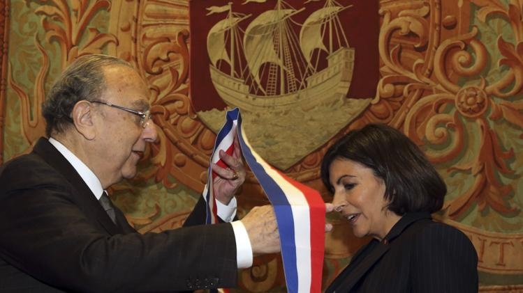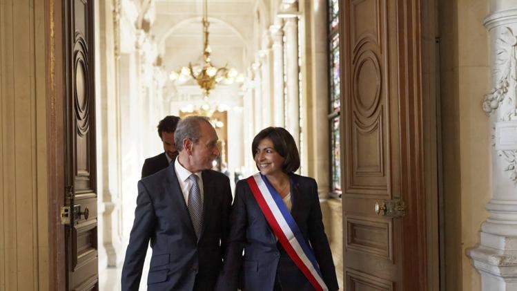 | Ông Bertrand Delanoe, thị trưởng mãn nhiệm của thành phố Paris, bước cùng thị trưởng đắc cử Anne Hidalgo trong Tòa thị chính thành phố trước lễ nhậm chức của bà Anne hôm 5/4. |
