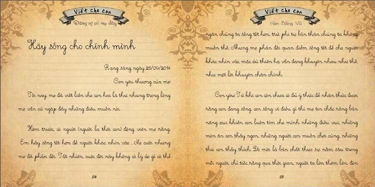 Trong tác phẩm mới, Hàn Băng Vũ nhắn gửi: “Vì cuộc đời là cơn bão lớn, mẹ không thể cho con bình yên bằng cách giả vờ, mẹ mong con sẽ đối mặt ngay từ khi con còn thơ dại. Hãy nhớ lời mẹ, ngay cả khi con như thế nào, con không bao giờ được chấp nhận những giá trị mà người khác áp đặt cho mình. Không bao giờ được chấp nhận rằng mình ngu dốt, xấu xí, hèn mọn chỉ vì người khác nói thế. Phải ngẩng cao đầu, sống bằng giá trị của mình, của những người yêu thương mình. Riêng với con, con không được chấp nhận rằng con không có cha ở bên nên địa vị con sẽ thấp kém, hay cuộc đời con sẽ thất bại hơn người khác. Con hãy nhớ lấy những điều mẹ đã nói bên trên kia, đừng sống vì một cái tên, đừng cúi mặt vì xuất phát điểm, cũng đừng bao giờ - tuyệt đối đừng bao giờ để mình tổn thương vì những giá trị mà người khác nói. Con hãy sống để tự hào vì chính cách sống của mình. Vì còn có mẹ luôn tự hào vì đã có con đây. Mẹ luôn yêu thương con".