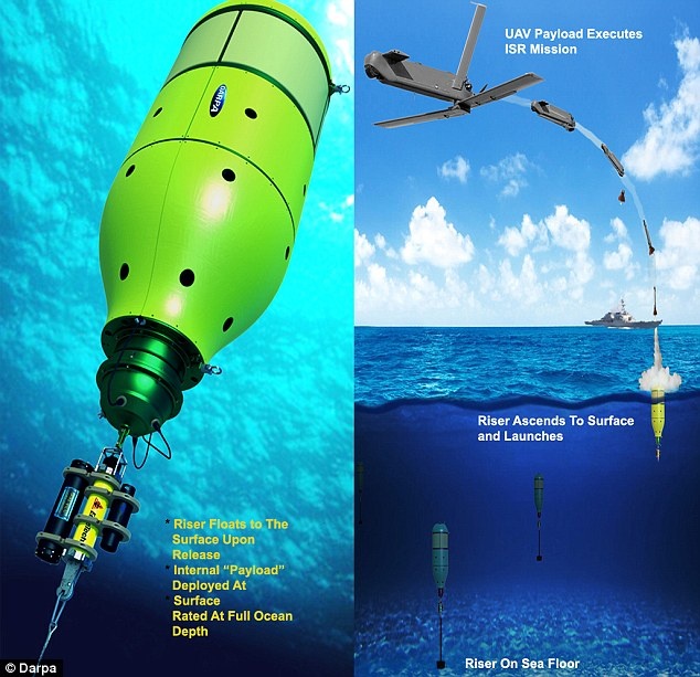 | Chiếc kén robot nổi lên mặt nước để phóng ra phương tiện do thám. Hiện tại, các công đoạn này do tàu ngầm thực hiện nên chi phí cũng đắt đỏ hơn nhiều. |