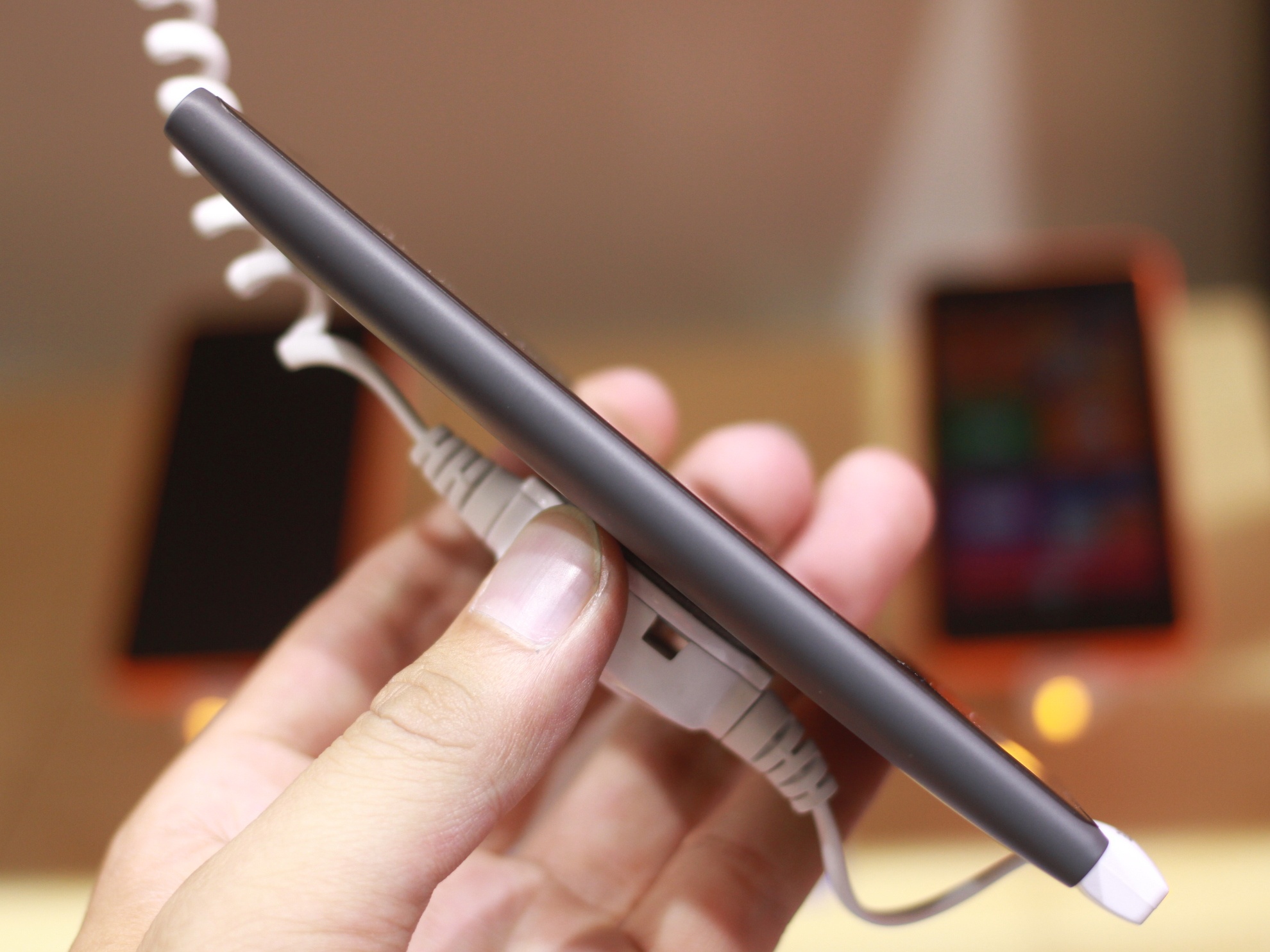 | Thiết kế của Lumia 730 cong ở hai cạnh và mặt sau ôm vào tay. Điều này cho phép người dùng cầm dễ hơn. Đây là góc nhìn từ cạnh trái. |