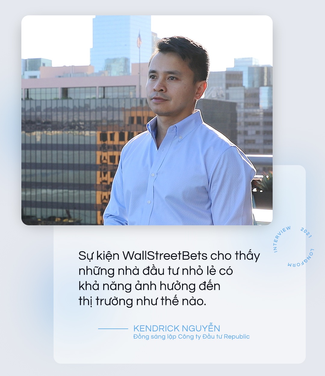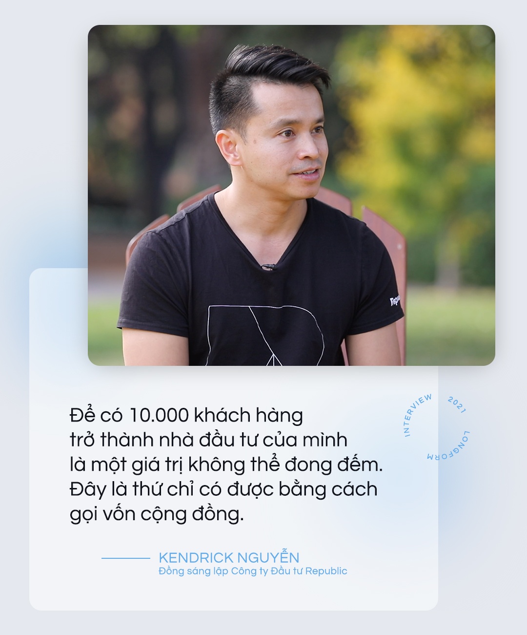 Trong bài phỏng vấn với Zing, Kendrick Nguyễn hào hứng chia sẻ quan điểm của mình về đầu tư, chú trọng vào những nhà đầu tư nhỏ lẻ và nền tảng gọi vốn cho các công ty thuộc về số ít. Republic là một công ty đang để lại dấu ấn trong lĩnh vực đầu tư nhỏ lẻ và gọi vốn cộng đồng. Trong suốt 5 năm thành lập, nền tảng này đã huy động thành công 300 triệu USD vốn cho các công ty khởi nghiệp.