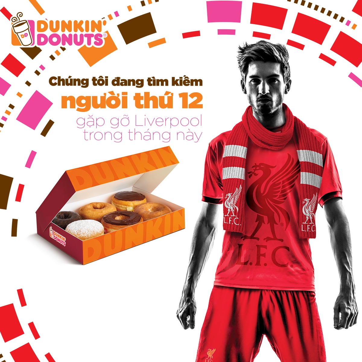 Chương trình Tìm kiếm người thứ 12 gặp gỡ Liverpool của Dunkin’ Donuts diễn ra từ ngày 15/6 đến ngày 11/7, thu hút sự tham gia của hàng nghìn bạn trẻ. Với mỗi hộp 6 donut giá bán 100.000 đồng, khách hàng sẽ nhận được một phiếu rút thăm trúng thưởng cho chuyến đi tuyệt vời này.
