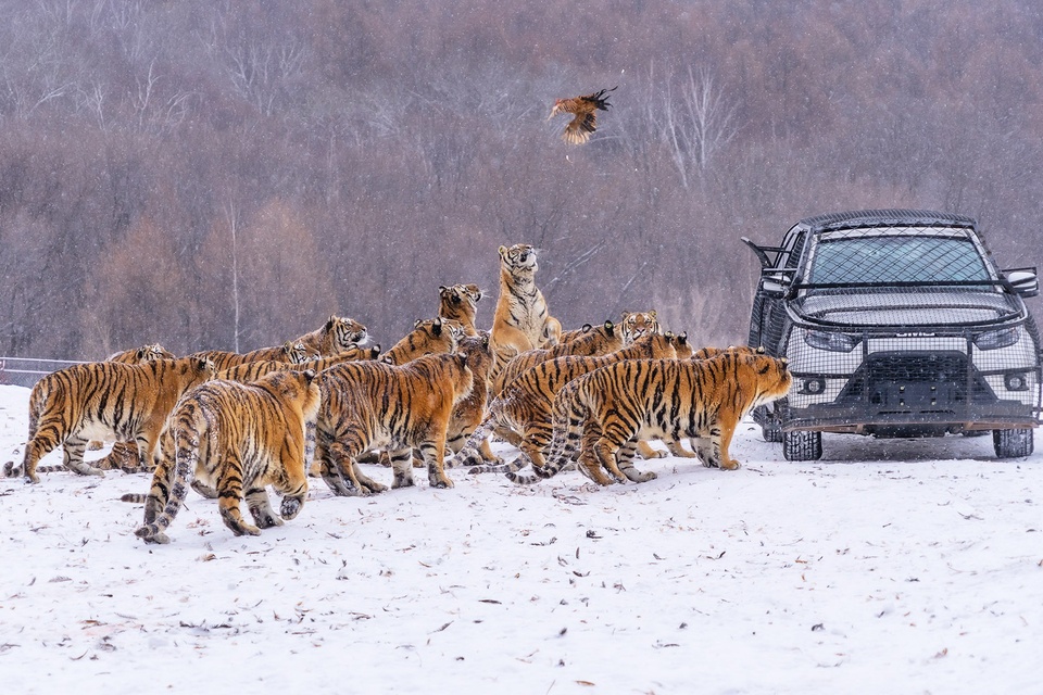 | Du khách có thể đi xe vào giữa vườn thú để tận mắt chứng kiến hổ săn mồi. Ảnh: Reuters. |