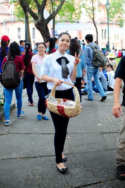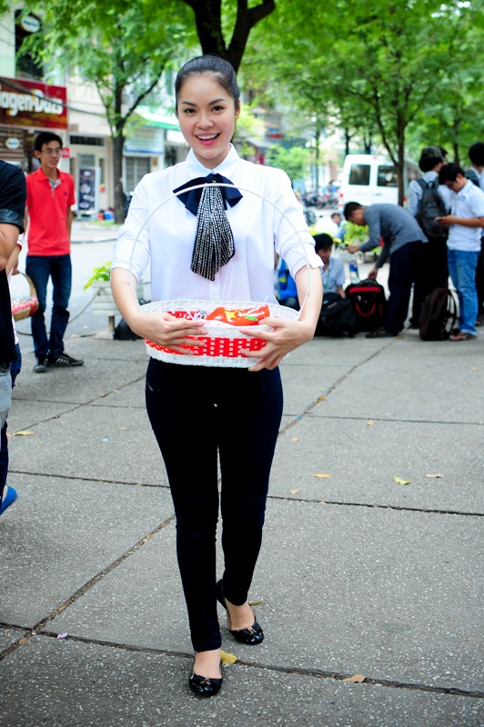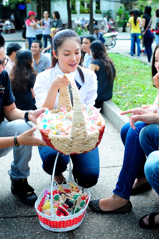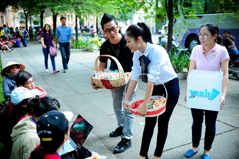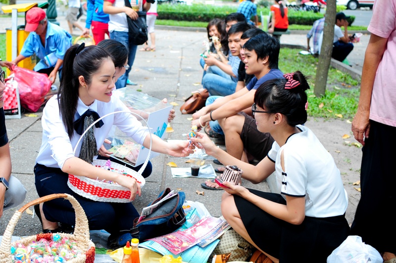 Hiểu được công việc thầm lặng mà đáng tự hào của các em nhỏ khuyết tật, Dương Cẩm Lynh đã tự tay đem những sản phẩm do các em làm ra công viên 23/9 để rao bán.