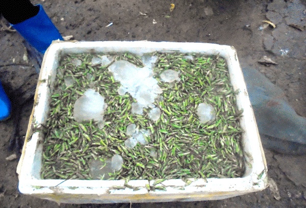 Châu chấu được ướp lạnh đựng trong thùng xốp. |