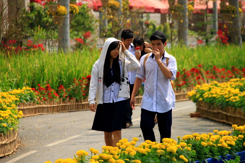Trưa 23/1, một nhóm học sinh tranh thủ giờ nghỉ đi tham quan đường hoa.