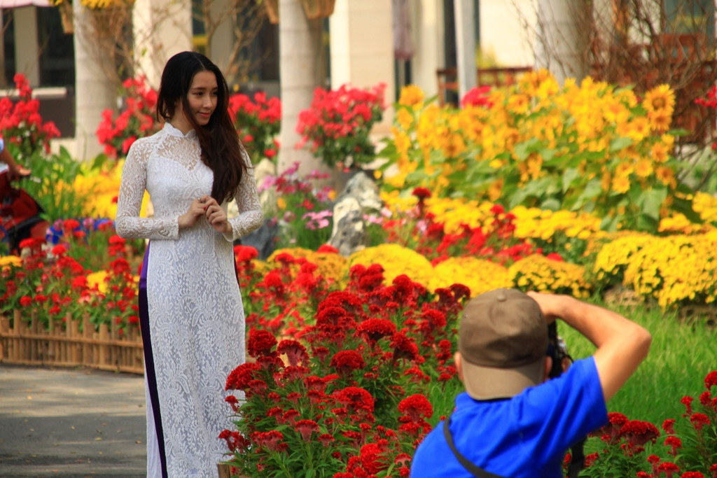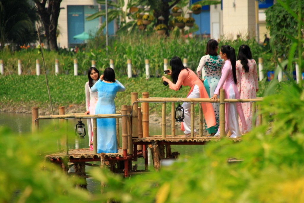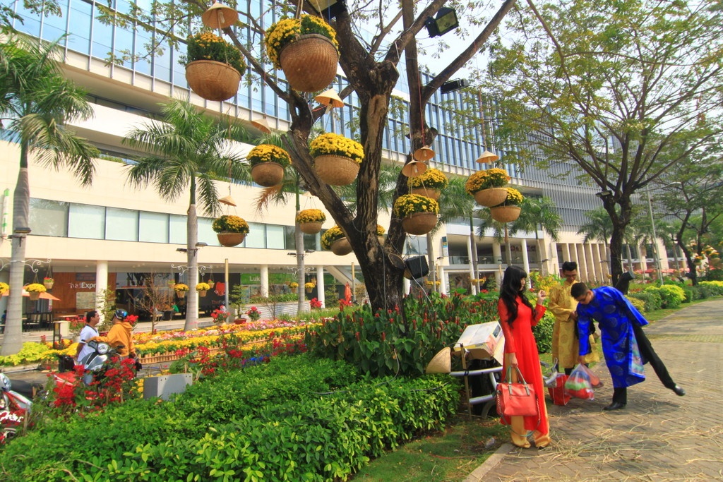 Trong những ngày giáp Tết, giới trẻ Sài thành đã diện áo dài, khăn xếp đổ về khu đô thị mới Phú Mỹ Hưng - nơi được mệnh danh là phố nhà giàu để chụp ảnh.