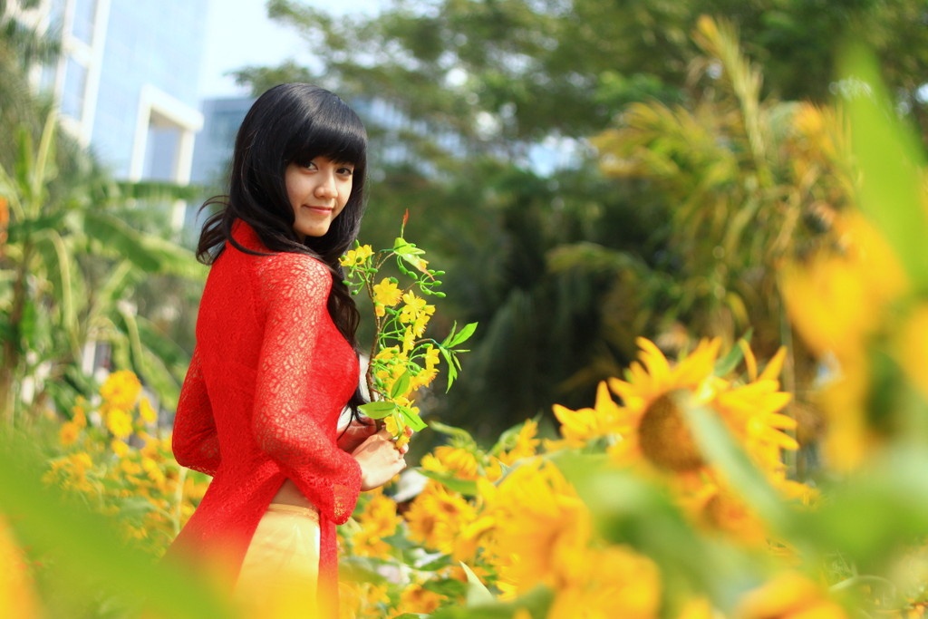 | Để hợp với khung cảnh hương đồng gió nội, rất nhiều nữ sinh mặc áo dài tham quan đường hoa. |