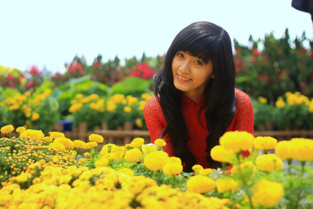 | Thiếu nữ duyên dáng trong tà áo dài mang đậm nét mùa xuân. |