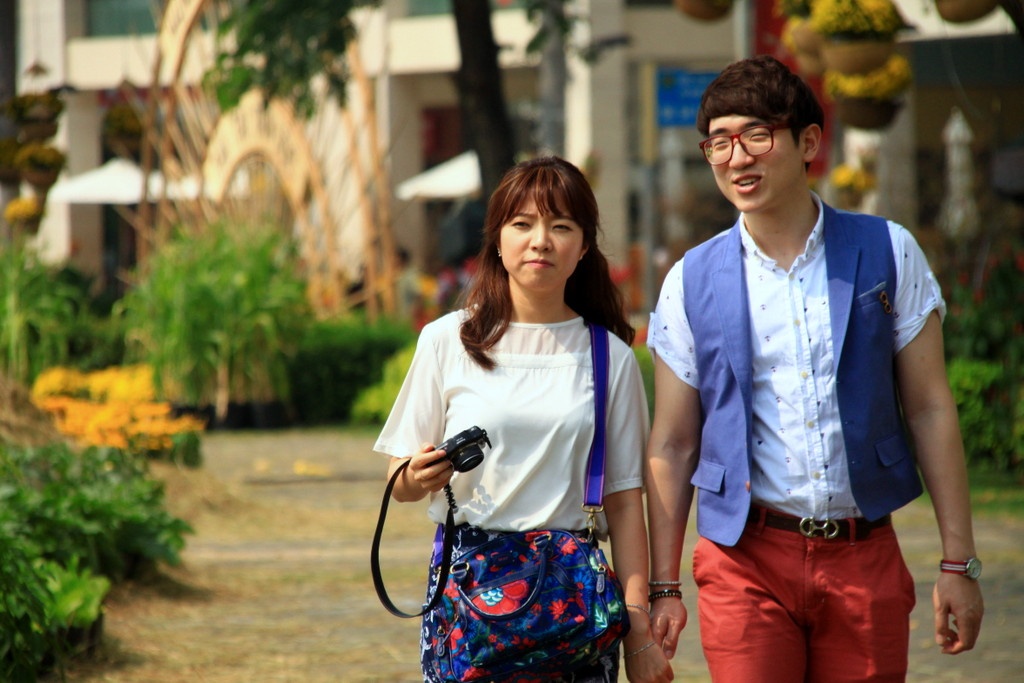 | Đôi bạn trẻ người Hàn Quốc thích thú với khung cảnh bình yên, đẹp đẽ của đường hoa. |