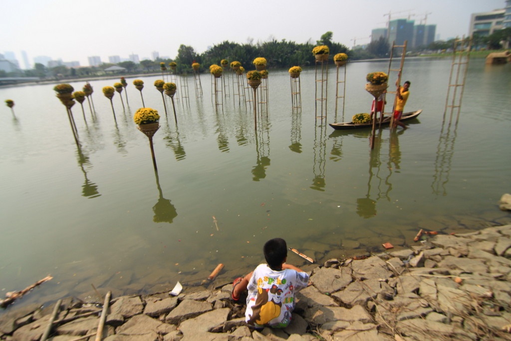 | Nằm ở phố nhà giàu, giữa những tòa nhà hiện đại, cảnh quan của đường hoa lại được trang trí với chủ đề hương đồng gió nội, mang đậm chất dân dã của làng quê với những tiểu cảnh ao sen, rừng đước, bến nước, ruộng đồng... |