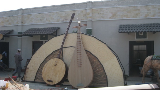 | Tại khu du lịch Tân Cảng nơi đang thi công những nhạc cụ khổng lồ như đàn tì bà, đàn nhị, đàn tranh, đàn bầu với kích cỡ 2,9 - 3,8m. |
