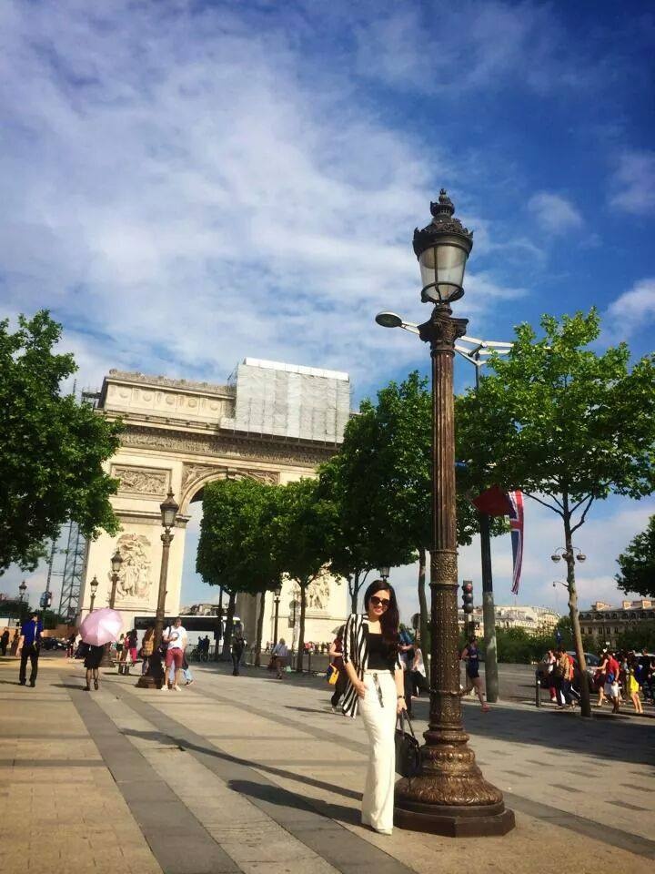 | Người đẹp khoe dáng sành điệu trước Khải Hoàn Môn. |