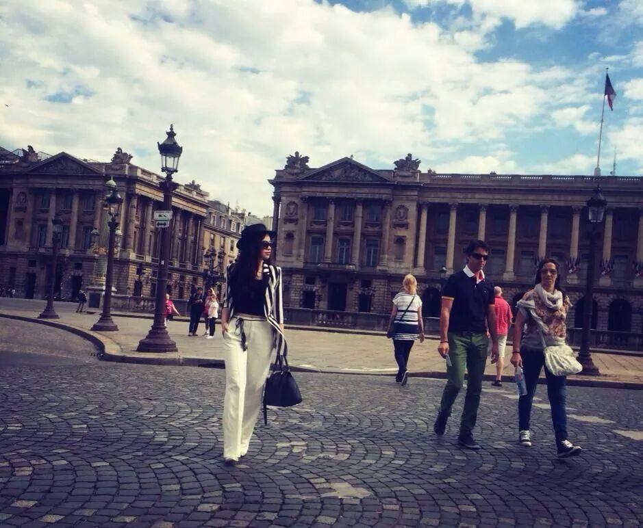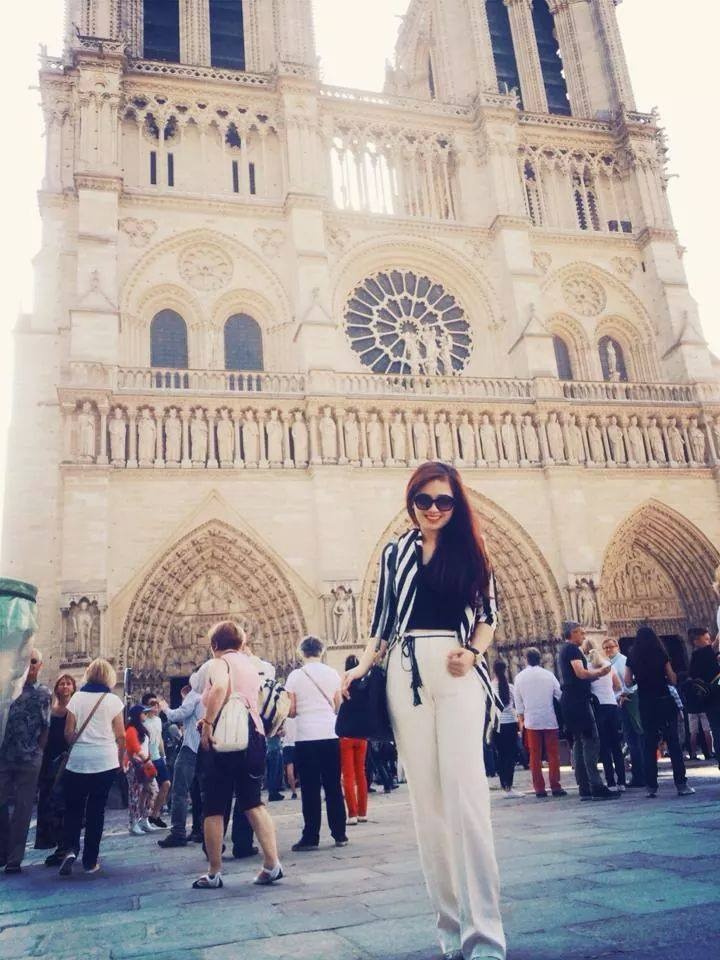 | Nữ ca sĩ sinh năm 1991 rạng rỡ chụp ảnh trước Nhà thờ Đức bà Paris. Đây là một nhà thờ Công giáo tiêu biểu cho phong cách kiến trúc gothic của Paris. |