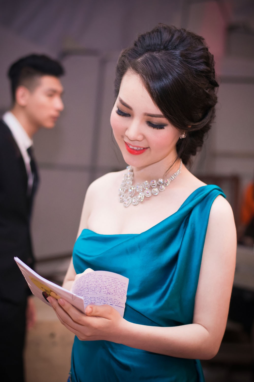 | Trong khi đó, đảm nhận vai trò MC của chương trình, Thụy Vân tranh thủ kiểm tra lại các thông tin lời dẫn mà mình đã chuẩn bị từ trước để tránh trường hợp nói hớ, nói vấp. |