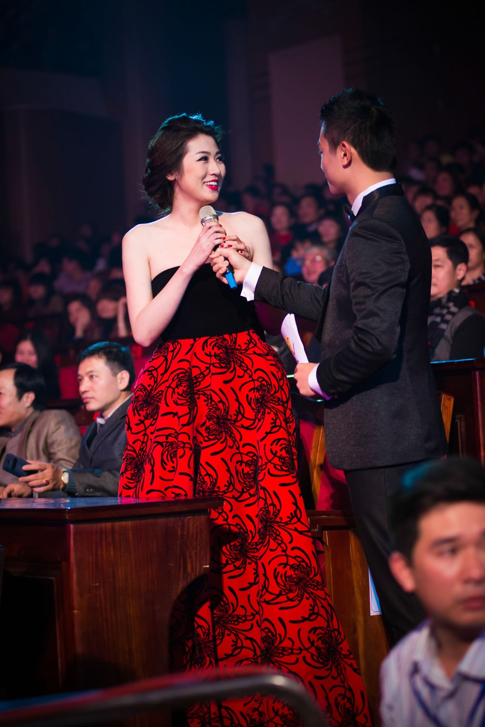 | Là ca sĩ khách mời của chương trình, Hoàng Yến chọn bộ đầm khá đơn giản nhưng sang trọng với màu vàng nhạt và những phụ kiện ton-sur-ton. Cô tái ngộ đàn anh Minh Quân ở phía hậu trường của sự kiện. Hai anh em rôm rả trò chuyện và bàn bạc về những dự án mới. |