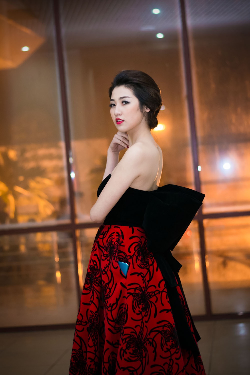 | Cô khéo léo khoe vai trần gợi cảm và chiếc nơ bướm đính sau bộ đầm kiêu sa. |