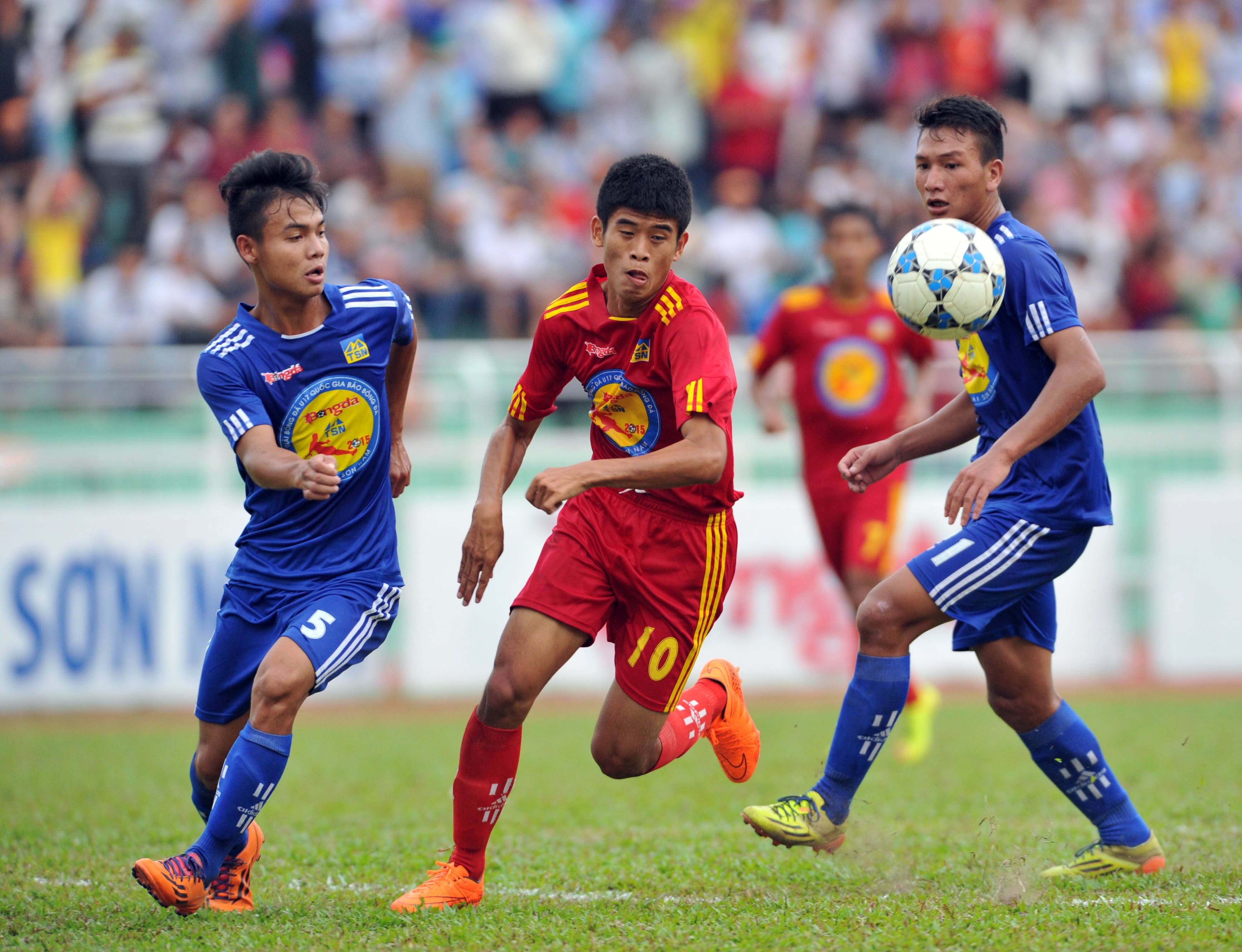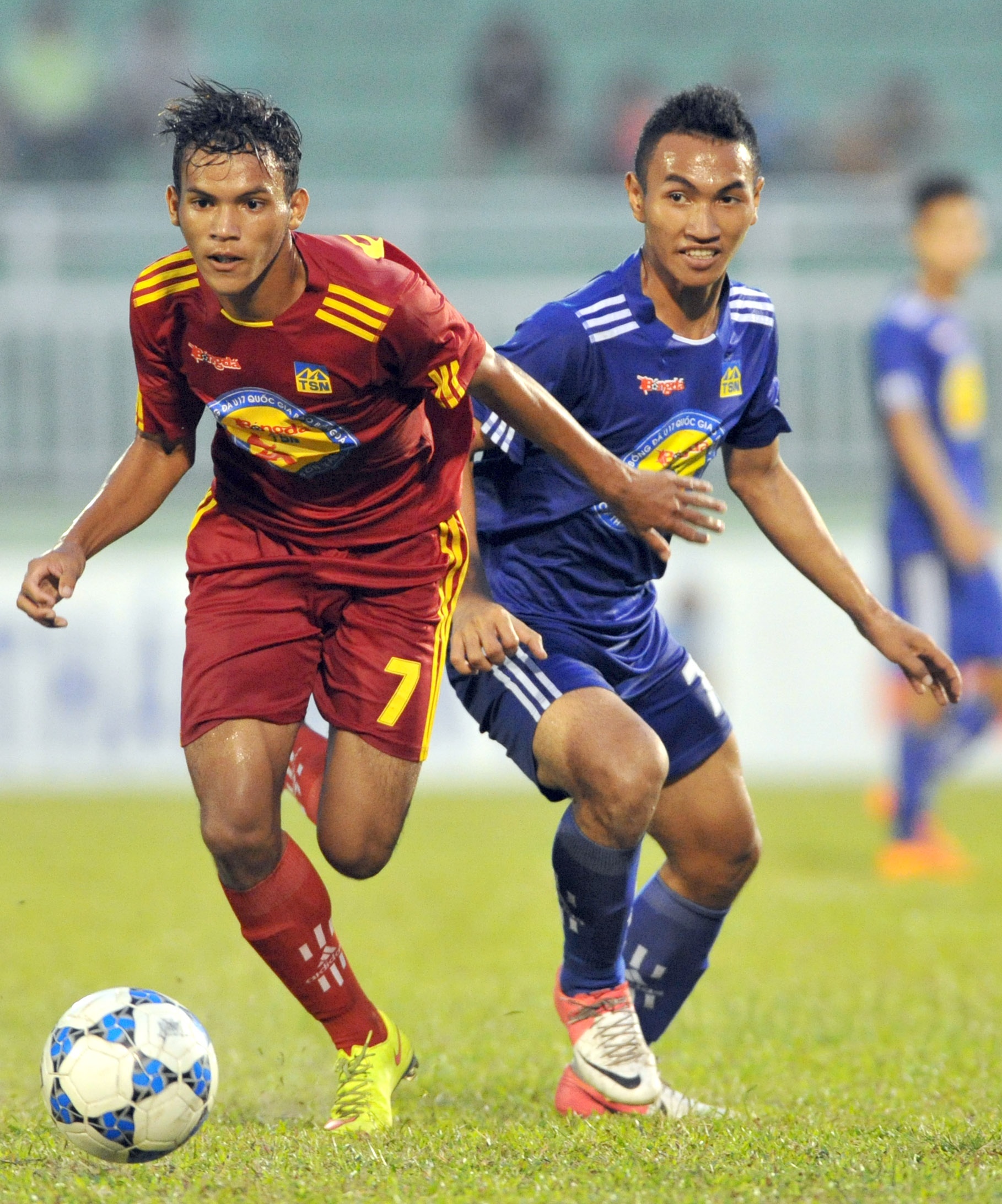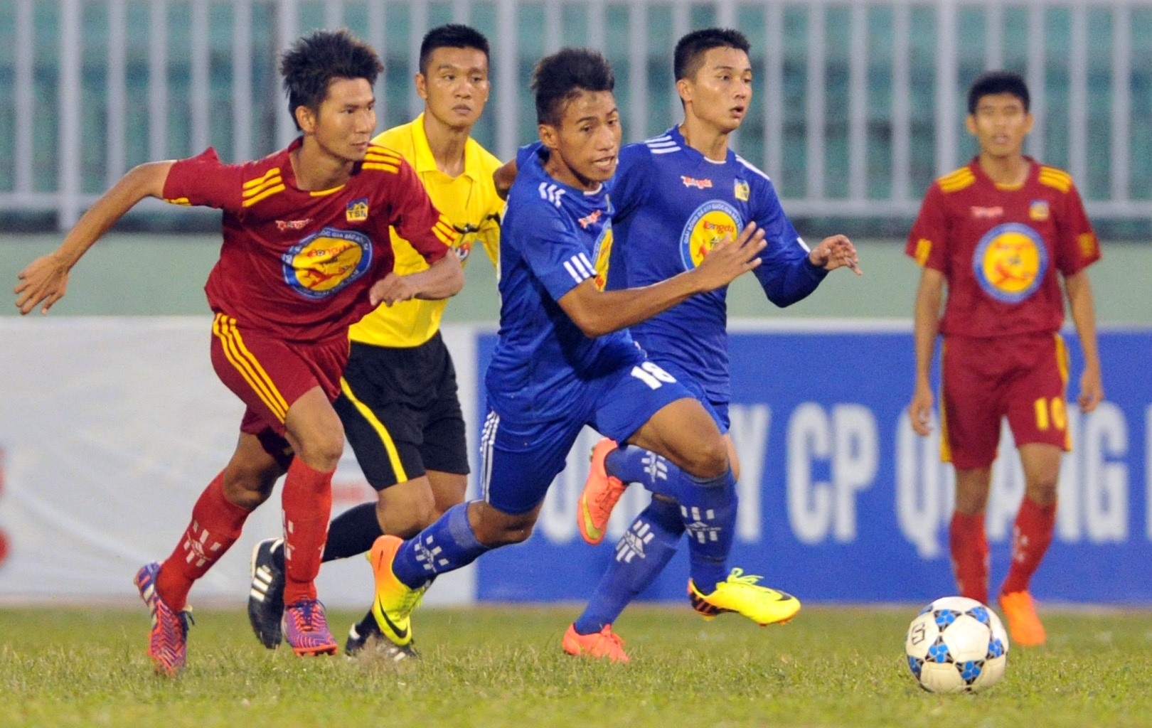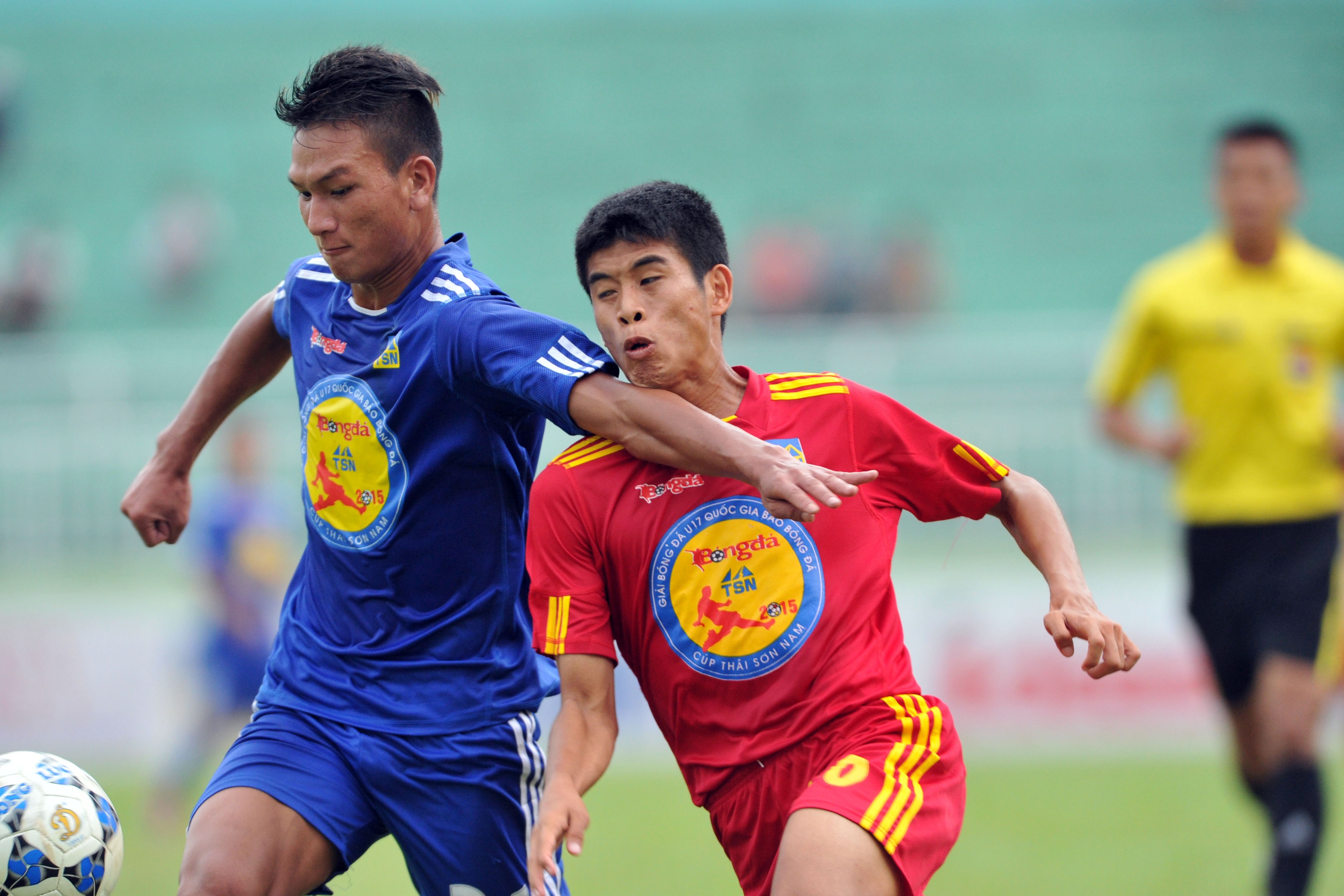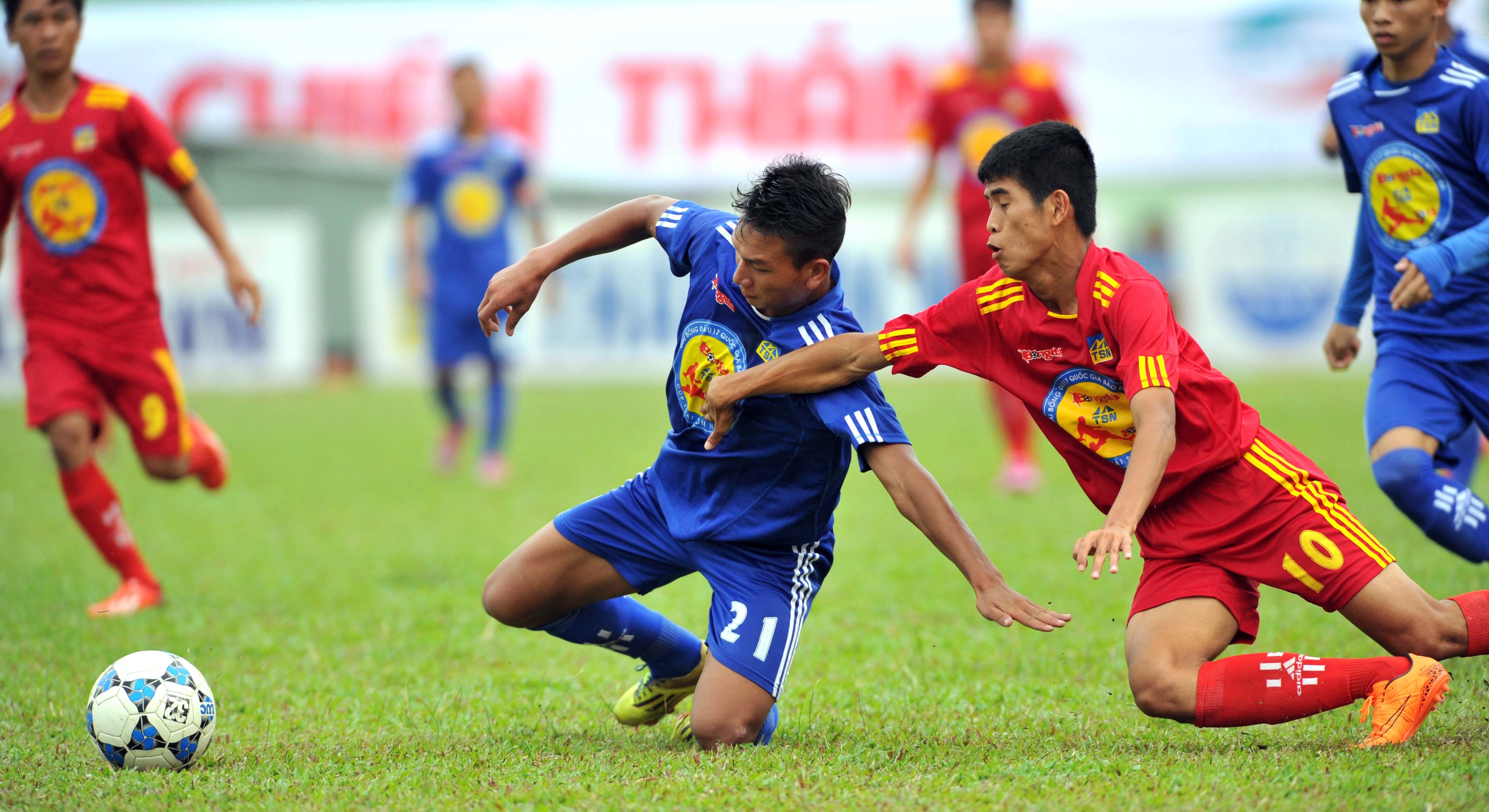 U17 Quảng Ngãi (áo xanh) là đội bóng gây bất ngờ nhất tại vòng bảng khi đứng thứ 2 bảng A sau U17 Viettel. Tại bán kết, họ gặp ứng cử viên số một cho chức vô địch, U17 PVF. Tính cả vòng loại cũng như vòng bảng, PVF ghi hơn 70 bàn thắng, không để thua bàn nào. |