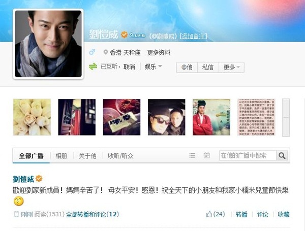 Lưu Khải Uy còn không quên chúc mừng đến các em nhỏ nhân ngày Quốc tế Thiếu nhi: “Mong muốn tất cả trẻ em trên thế giới và mẹ con Tiểu Nhu Mễ của bố mẹ vui vẻ”.